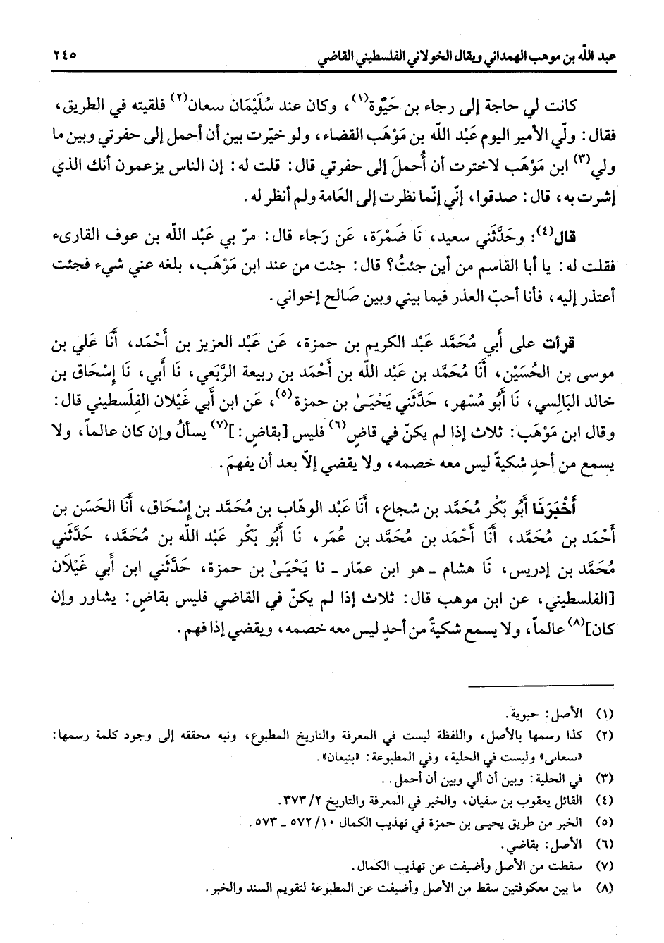 كانت لي حاجة إلى رجاء بن حيوة (1) وكان عند سليمان سعان (2) فلقيته في الطريق فقال ولي الأمير اليوم عبد الله بن موهب القضاء ولو خيرت بين أن أحمل إلى حفرتي وبين ما ولي (3) ابن موهب لاخترت أن أحمل إلى حفرتي قال قلت له إن الناس يزعمون أنك الذي إشرت به صدقوا إني إنما نظرت إلى العامة ولم أنظر له قال (4) وحدثني سعيد نا ضمرة عن رجاء قال مر بي عبد الله بن عوف القارئ فقلت له يا أبا القاسم من أين جئت قال جئت من عند ابن موهب بلغه عني شئ فجئت أعتذر إليه فأنا أحب العذر فيما بيني وبين صالح إخواني قرأت على أبي محمد عبد الكريم بن حمزة عن عبد العزيز بن أحمد أنا علي بن موسى بن الحسين أنا محمد بن عبد الله بن أحمد بن ربيعة الربعي نا أبي نا إسحاق بن خالد البالسي نا أبو مسهر حدثني يحيى بن حمزة عن ابن أبي غيلان (5) الفلسطيني قال وقال ابن موهب ثلاث إذا لم يكن في قاض (6) فليس بقاض (7) يسأل وإن كان عالما ولا يسمع من أحد شكية ليس معه خصمه ولا يقضي إلا بعد أن يفهم أخبرنا أبو بكر محمد بن شجاع أنا عبد الوهاب بن محمد بن إسحاق أنا الحسن بن أحمد بن محمد أنا أحمد بن محمد بن عمر نا أبو بكر عبد الله بن محمد حدثني محمد بن إدريس نا هشام هو ابن عمار نا يحيى بن حمزة حدثني ابن أبي غيلان الفلسطيني عن ابن موهب قال ثلاث إذا لم يكن في القاضي فليس بقاض يشاور وإن كان (8) عالما ولا يسمع شكية من أحد ليس معه خصمه ويقضي إذا فهم
