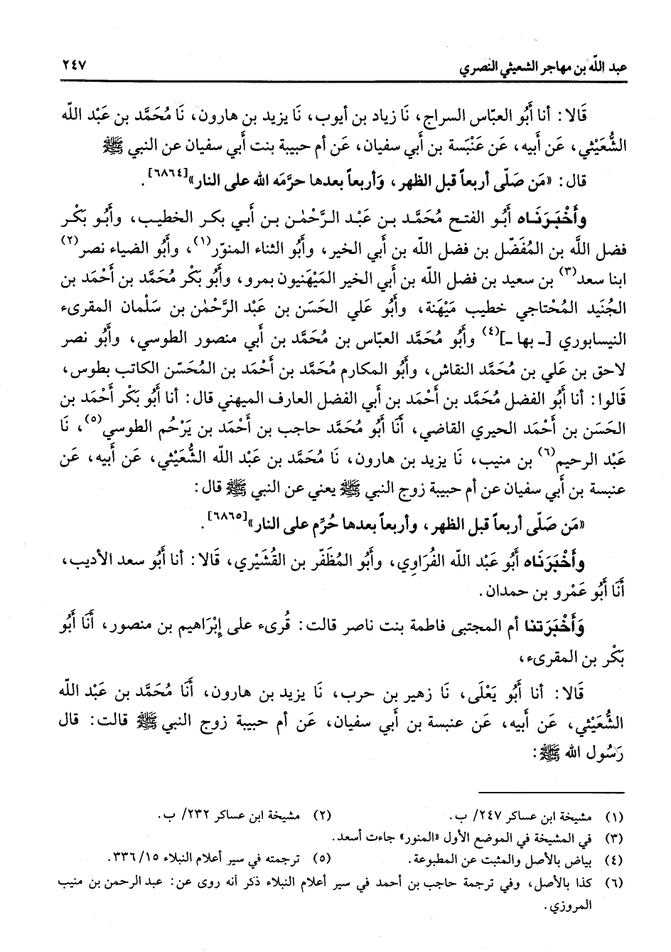 قالا أنا أبو العباس السراج نا زياد بن أيوب نا يزيد بن هارون نا محمد بن عبد الله الشعيثي عن أبيه عن عنبسة بن أبي سفيان عن أم حبيبة بنت أبي سفيان عن النبي (صلى الله عليه وسلم) قال من صلى أربعا قبل الظهر وأربعا بعدها حرمه الله على النار وأخبرناه أبو الفتح محمد بن عبد الرحمن بن أبي بكر الخطيب وأبو بكر فضل الله بن المفضل بن فضل الله بن أبي الخير وأبو الثناء المنور (1) وأبو الضياء نصر (2) ابنا سعد (3) بن سعيد بن فضل الله بن أبي الخير الميهنيون بمرو وأبو بكر محمد بن أحمد بن الجنيد المحتاجي خطيب ميهنة وأبو علي الحسن بن عبد الرحمن بن سلمان المقرئ النيسابوري بها (4) وأبو محمد العباس بن محمد بن أبي منصور الطوسي وأبو نصر لاحق بن علي بن محمد النقاش وأبو المكارم محمد بن أحمد بن المحسن الكاتب بطوس قالوا أنا أبو الفضل محمد بن أحمد بن أبي الفضل العارف الميهني قال أنا أبو بكر أحمد بن الحسن بن أحمد الحيري القاضي أنا أبو محمد حاجب بن أحمد بن يرحم الطوسي (5) نا عبد الرحيم (6) بن منيب نا يزيد بن هارون نا محمد بن عبد الله الشعيثي عن أبيه عن عنبسة بن أبي سفيان عن أم حبيبة زوج النبي (صلى الله عليه وسلم) يعني عن النبي (صلى الله عليه وسلم) قال من صلى أربعا قبل الظهر وأربعا بعدها حرم على النار وأخبرناه أبو عبد الله الفراوي وأبو المظفر بن القشيري قالا أنا أبو سعد الأديب أنا أبو عمرو بن حمدان وأخبرتنا أم المجتبى فاطمة بنت ناصر قالت قرئ على إبراهيم بن منصور أنا أبو بكر بن المقرئ قالا أنا أبو يعلى نا زهير بن حرب نا يزيد بن هارون أنا محمد بن عبد الله الشعيثي عن أبيه عن عنبسة بن أبي سفيان عن أم حبيبة زوج النبي (صلى الله عليه وسلم) قالت قال رسول الله (صلى الله عليه وسلم)