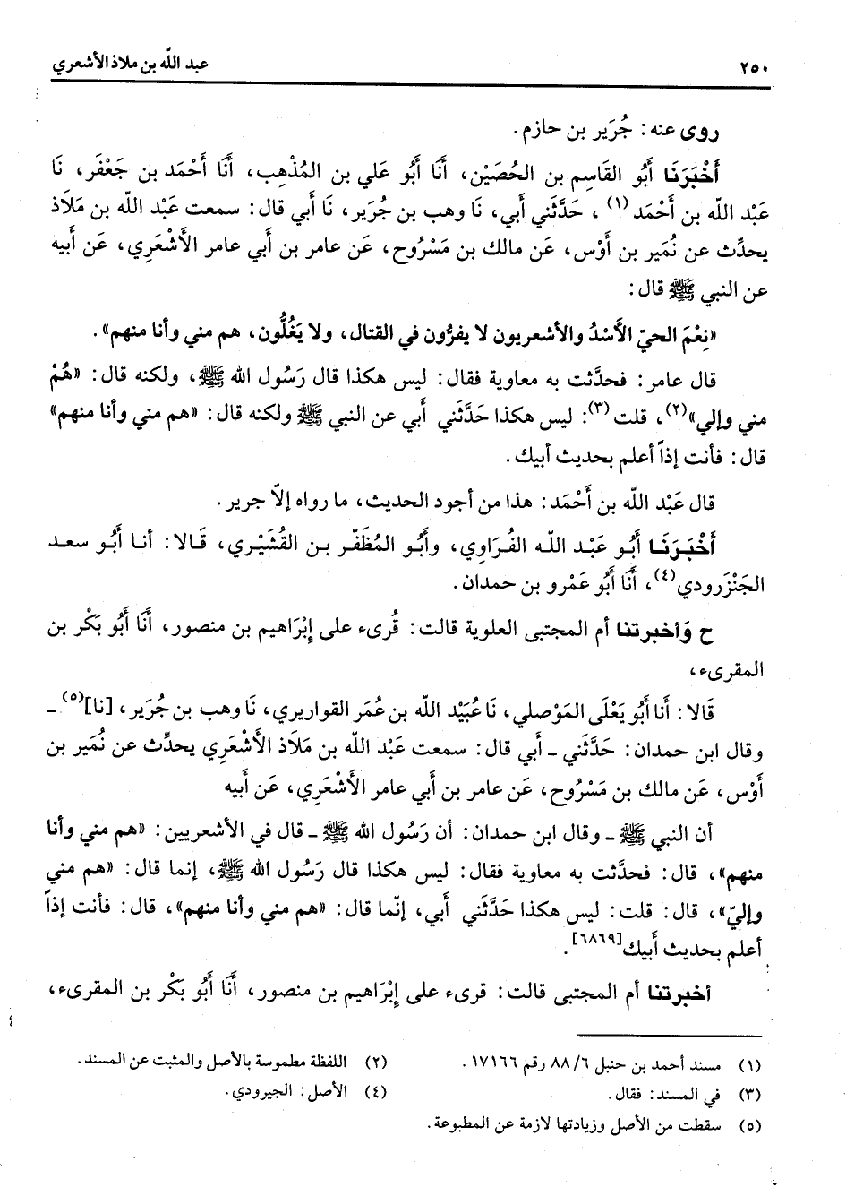 روى عنه جرير بن حازم أخبرنا أبو القاسم نا عبد الله بن أحمد حدثني بن الحصين أنا أبو علي بن المذهب أنا أحمد بن جعفر نا عبد الله بن أحمد (1) حدثني أبي نا وهب بن جرير نا أبي قال سمعت عبد الله بن ملاذ يحدث عن نمير بن أوس عن مالك بن مسروح عن عامر بن أبي عامر الأشعري عن أبيه عن النبي (صلى الله عليه وسلم) قال نعم الحي الأسد والأشعريون لا يفرون في القتال ولا يغلون هم مني وأنا منهم قال عامر فحدثت به معاوية فقال ليس هكذا قال رسول الله (صلى الله عليه وسلم) ولكنه قال هم مني وإلي (2) قلت (3) ليس هكذا حدثني أبي عن النبي (صلى الله عليه وسلم) ولكنه قال هم مني وأنا منهم [* * * * قال فانت إذا أعلم بحديث أبيك قال عبد الله بن أحمد هذا من أجود الحديث ما رواه إلا جرير أخبرنا أبو عبد الله الفراوي وأبو المظفر بن القشيري قالا أنا أبو سعد الجنزرودي (4) أنا أبو عمرو بن حمدان ح وأخبرتنا أم المجتبى العلوية قالت قرئ على إبراهيم بن منصور أنا أبو بكر بن المقرئ قالا أنا أبو يعلى الموصلي نا عبيد الله بن عمر القواريري نا وهب بن جرير نا (5) وقال ابن حمدان حدثني أبي قال سمعت عبد الله بن ملاذ الأشعري يحدث عن نمير بن أوس عن مالك بن مسروح عن عامر بن أبي عامر الأشعري عن أبيه أن النبي (صلى الله عليه وسلم) وقال ابن حمدان أن رسول الله (صلى الله عليه وسلم) قال في الأشعريين هم مني وأنا منهم قال فحدثت به معاوية فقال ليس هكذا قال رسول الله (صلى الله عليه وسلم) إنما قال هم مني وإلي قال قلت ليس هكذا حدثني أبي إنما قال هم مني وأنا منهم قال فأنت إذا أعلم بحديث أبيك أخبرتنا أم المجتبى قالت قرئ على إبراهيم بن منصور أنا أبو بكر بن المقرئ