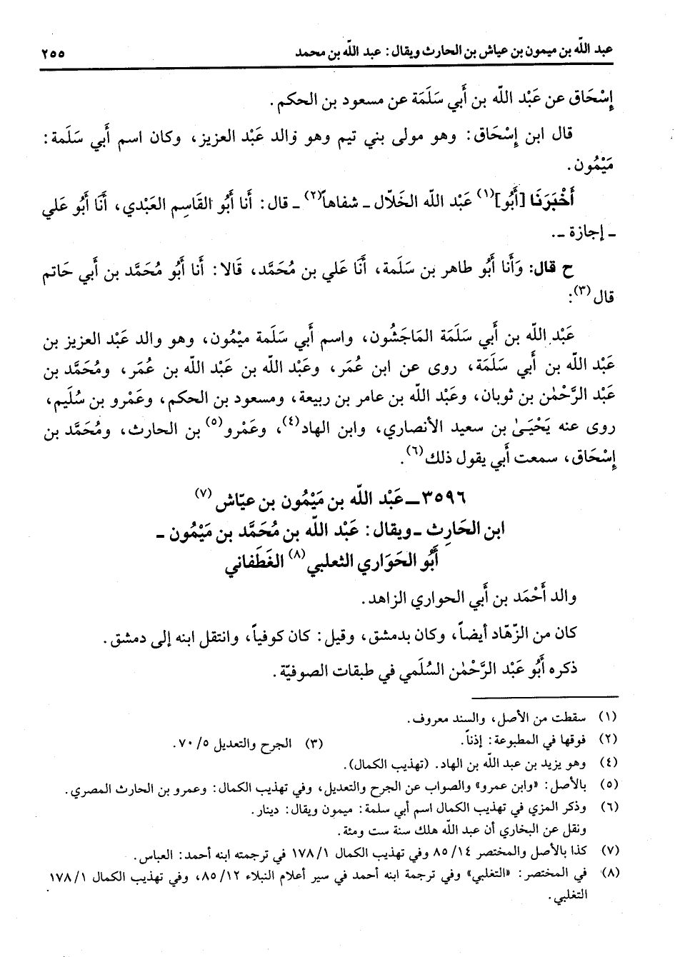 3596 - عبد الله بن ميمون بن عياش (7) ابن الحارث ويقال عبد الله بن محمد بن ميمون أبو الحواري الثعلبي (8) الغطفاني والد أحمد بن أبي الحواري الزاهد كان من الزهاد أيضا وكان بدمشق وقيل كان كوفيا وانتقل ابنه إلى دمشق ذكره أبو عبد الرحمن السلمي في طبقات الصوفية