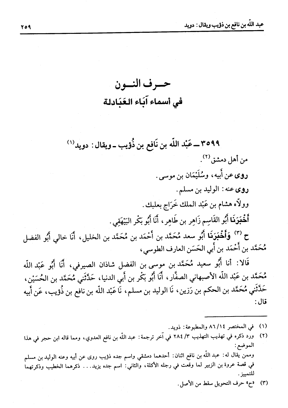(2) ورد ذكره في تهذيب التهذيب 3 / 284 في آخر ترجمة: عبد الله بن نافع العدوي ومما قاله ابن حجر في هذا الموضع: وممن يقال له: عبد الله بن نافع اثنان: أحدهما دمشقي واسم جده ذؤيب روى عن أبيه وعنه الوليد بن مسلم في قصة عروة بن الزبير لما وقعت في رجله الاكلة والثاني: اسم جده يزيد