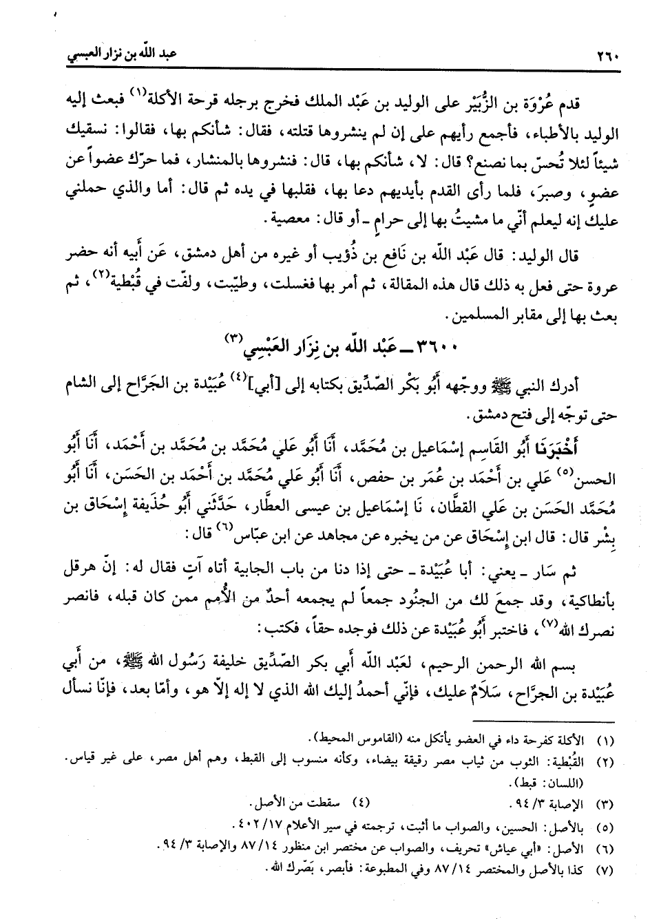 3600 - عبد الله بن نزار العبسي (3) أدرك النبي (صلى الله عليه وسلم) ووجهه أبو بكر الصديق بكتابه إلى أبي (4) عبيدة بن الجراح إلى الشام حتى توجه إلى فتح دمشق أخبرنا أبو القاسم إسماعيل بن محمد أنا أبو علي محمد بن محمد بن أحمد أنا أبو الحسن (5) علي بن أحمد بن عمر بن حفص أنا أبو علي محمد بن أحمد بن الحسن أنا أبو محمد الحسن بن علي القطان نا إسماعيل بن عيسى العطار حدثني أبو حذيفة إسحاق بن بشر قال قال ابن إسحاق عن من يخبره عن مجاهد عن ابن عباس (6) قال ثم سار يعني أبا عبيدة حتى إذا دنا من باب الجابية أتاه آت فقال له إن هرقل بأنطاكية وقد جمع لك من الجنود جمعا لم يجمعه أحد من الأمم ممن كان قبله فانصر نصرك الله (7) فاختبر أبو عبيدة عن ذلك فوجده حقا فكتب بسم الله الرحمن الرحيم لعبد الله أبي بكر الصديق خليفة رسول الله (صلى الله عليه وسلم) من أبي عبيدة بن الجراح سلام عليك فإني أحمد إليك الله الذي لا إله إلا هو وأما بعد فإنا نسأل