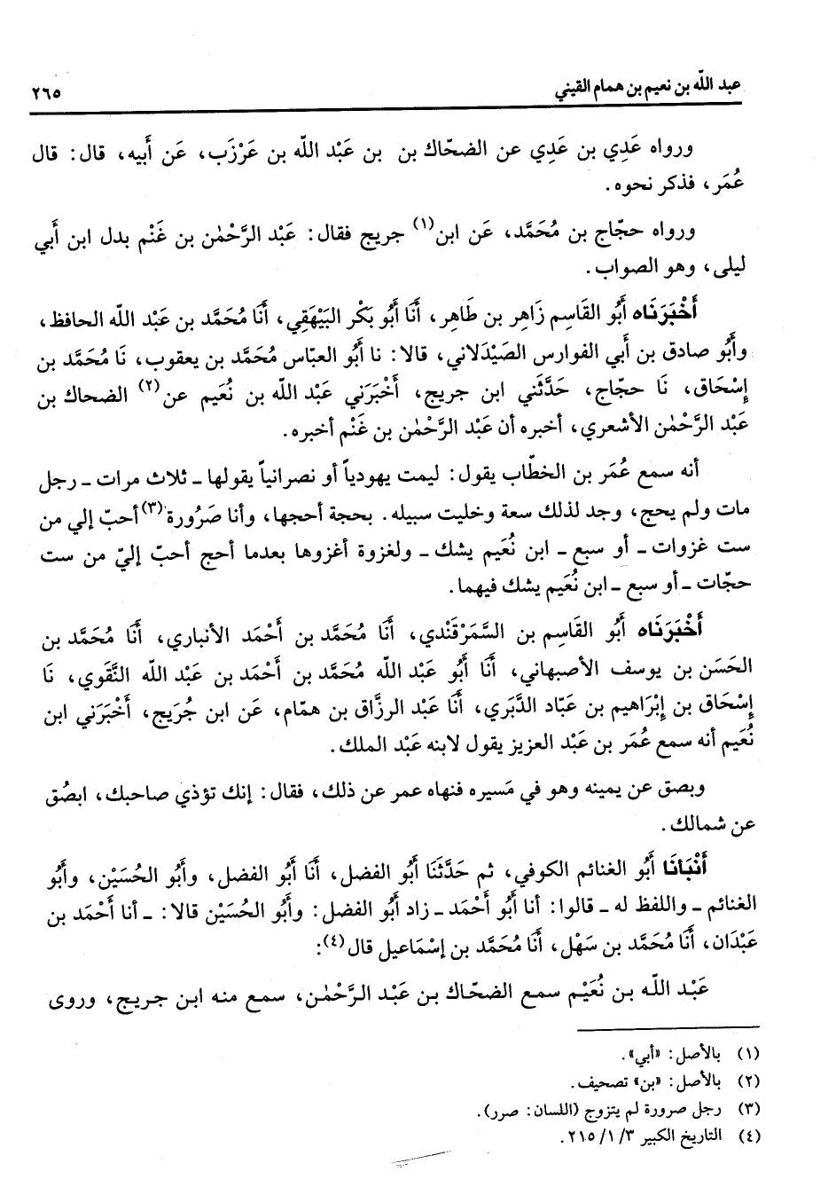 ورواه عدي بن عدي عن الضحاك بن بن عبد الله بن عرزب عن أبيه قال قال عمر فذكر نحوه ورواه حجاج بن محمد عن ابن (1) جريج فقال عبد الرحمن بن غنم بدل ابن أبي ليلى وهو الصواب أخبرناه أبو القاسم زاهر بن طاهر أنا أبو بكر البيهقي أنا محمد بن عبد الله الحافظ وأبو صادق بن أبي الفوارس الصيدلاني قالا نا أبو العباس محمد بن يعقوب نا محمد بن إسحاق نا حجاج حدثني ابن جريج أخبرني عبد الله بن نعيم عن (2) الضحاك بن عبد الرحمن الأشعري أخبره أن عبد الرحمن بن غنم أخبره أنه سمع عمر بن الخطاب يقول ليمت يهوديا أو نصرانيا يقولها ثلاث مرات رجل مات ولم يحج وجد لذلك سعة وخليت سبيله بحجة أحجها وأنا صرورة (3) أحب إلي من ست غزوات أو سبع ابن نعيم يشك ولغزوة أغزوها بعدما أحج أحب إلي من ست حجات أو سبع ابن نعيم يشك فيها أخبرناه أبو القاسم بن السمرقندي أنا محمد بن أحمد الأنباري أنا محمد بن الحسن بن يوسف الأصبهاني أنا أبو عبد الله محمد بن أحمد بن عبد الله النقوي نا إسحاق بن إبراهيم بن عباد الدبري أنا عبد الرزاق بن همام عن ابن جريج أخبرني ابن نعيم أنه سمع عمر بن عبد العزيز يقول لابنه عبد الملك وبصق عن يمينه وهو في مسيرة فنهاه عمر عن ذلك فقال إنك تؤذي صاحبك ابصق عن شمالك أنبأنا أبو الغنائم الكوفي ثم حدثنا أبو الفضل أنا أبو الفضل وأبو الحسين وأبو الغنائم واللفظ له قالوا أنا أبو أحمد زاد أبو الفضل وأبو الحسين قالا أنا أحمد بن عبدان أنا محمد بن سهل أنا محمد بن إسماعيل قال (4) عبد الله بن نعيم سمع الضحاك بن عبد الرحمن سمع منه ابن جريج وروى