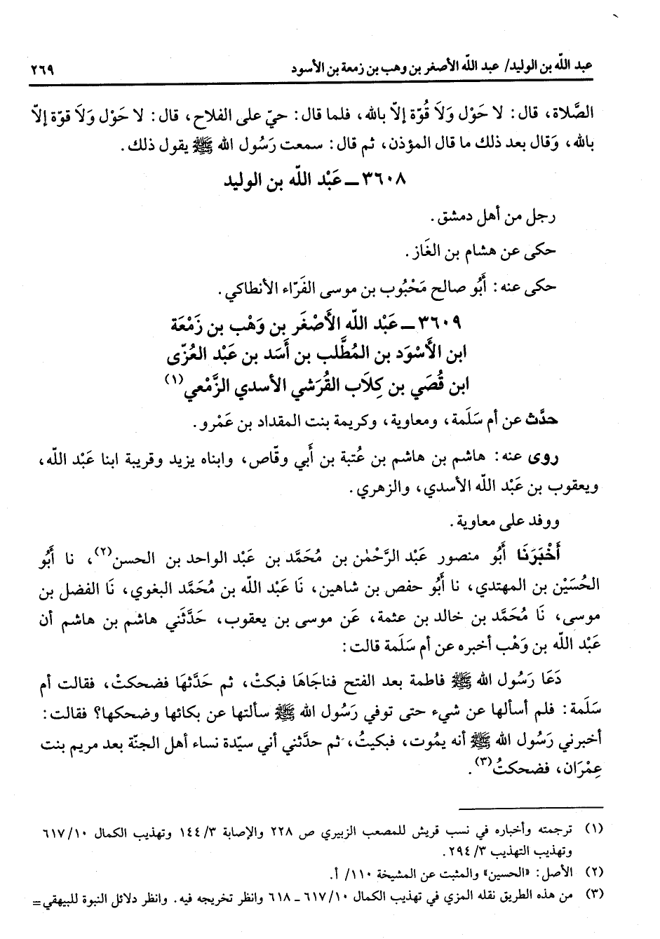 3609 - عبد الله الأصغر بن وهب بن زمعة ابن الأسود بن المطلب بن أسد بن عبد العزى ابن قصي بن كلاب القرشي الأسدي الزمعي (1) حدث عن أم سلمة ومعاوية وكريمة بنت المقداد بن عمرو روى عنه هاشم بن هاشم بن عتبة بن أبي وقاص وابناه يزيد وقريبة ابنا عبد الله ويعقوب بن عبد الله الأسدي والزهري ووفد على معاوية أخبرنا أبو منصور عبد الرحمن بن محمد بن عبد الواحد بن الحسن (2) نا أبو الحسين بن المهتدي نا أبو حفص بن شاهين نا عبد الله بن محمد البغوي نا الفضل بن موسى نا محمد بن خالد بن عثمة عن موسى بن يعقوب حدثني هاشم بن هاشم أن عبد الله بن وهب أخبره عن أم سلمة قالت دعا رسول الله (صلى الله عليه وسلم) فاطمة بعد الفتح فناجاها فبكت ثم حدثها فضحكت فقالت أم سلمة فلم أسألها عن شئ حتى توفي رسول الله (صلى الله عليه وسلم) سألتها عن بكائها وضحكها فقالت أخبرني رسول الله (صلى الله عليه وسلم) أنه يموت فبكيت ثم حدثني أني سيدة أهل الجنة بعد مريم بنت عمران فضحكت (3)
