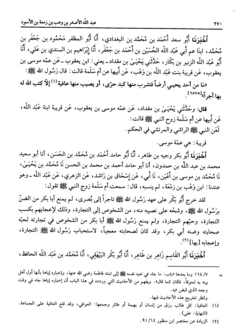 أخبرنا أبو سعد أحمد بن محمد بن البغدادي أنا أبو المظفر محمود بن جعفر بن محمد ابنا عم أبي عبد الله الحسين بن أحمد بن جعفر أنا إبراهيم بن السندي بن علي أنا أبو عبد الله الزبير بن بكار حدثني يحيى بن مقداد يعني ابن يعقوب عن عمه موسى بن يعقوب عن قريبة بنت عبد الله بن وهب عن أبيها عن أم سلمة قالت قال رسول الله (صلى الله عليه وسلم) ما من أحد يحيي أرضا فتشرب منها كبد حرى أو يصيب منها عافية (1) إلا كتب الله له بها أجرا قال وحدثني يحيى بن مقداد عن عمه موسى بن يعقوب عن قريبة ابنة عبد الله عن أبيها عن أم سلمة زوج النبي (صلى الله عليه وسلم) قالت لعن النبي (صلى الله عليه وسلم) الراشي والمرتشي في الحكم قريبة هي عمة موسى أخبرنا أبو بكر وجيه بن طاهر أنا أبو حامد أحمد بن محمد بن الحسن أنا أبو سعيد محمد بن عبد الله بن حمدون أنا أبو حامد أحمد بن محمد بن الحسن نا محمد بن يحيى نا محمد بن موسى بن أعين نا أبي عن إسحاق بن راشد عن الزهري عن عبد الله وهو عندنا ابن وهب بن زمعة لم ينسبه قال سمعت أم سلمة زوج النبي (صلى الله عليه وسلم) تقول لقد خرج أبو بكر على عهد رسول الله (صلى الله عليه وسلم) تاجرا إلى بصرى لم يمنع أبا بكر من الضن برسول الله (صلى الله عليه وسلم) وشحه على نصيبه منه من الشخوص إلى التجارة وذلك لإعجابهم بكسب التجارة وحبهم التجارة ولم يمنع رسول الله (صلى الله عليه وسلم) أبا بكر من الشخوص في تجارته لحبه صحابته وضنه أبي بكر وقد كان لصحابته معجبا لاستحباب رسول الله (صلى الله عليه وسلم) التجارة وإعجابه بها (2) أخبرنا أبو القاسم زاهر بن طاهر أنا أبو بكر البيهقي أنا محمد بن عبد الله الحافظ
