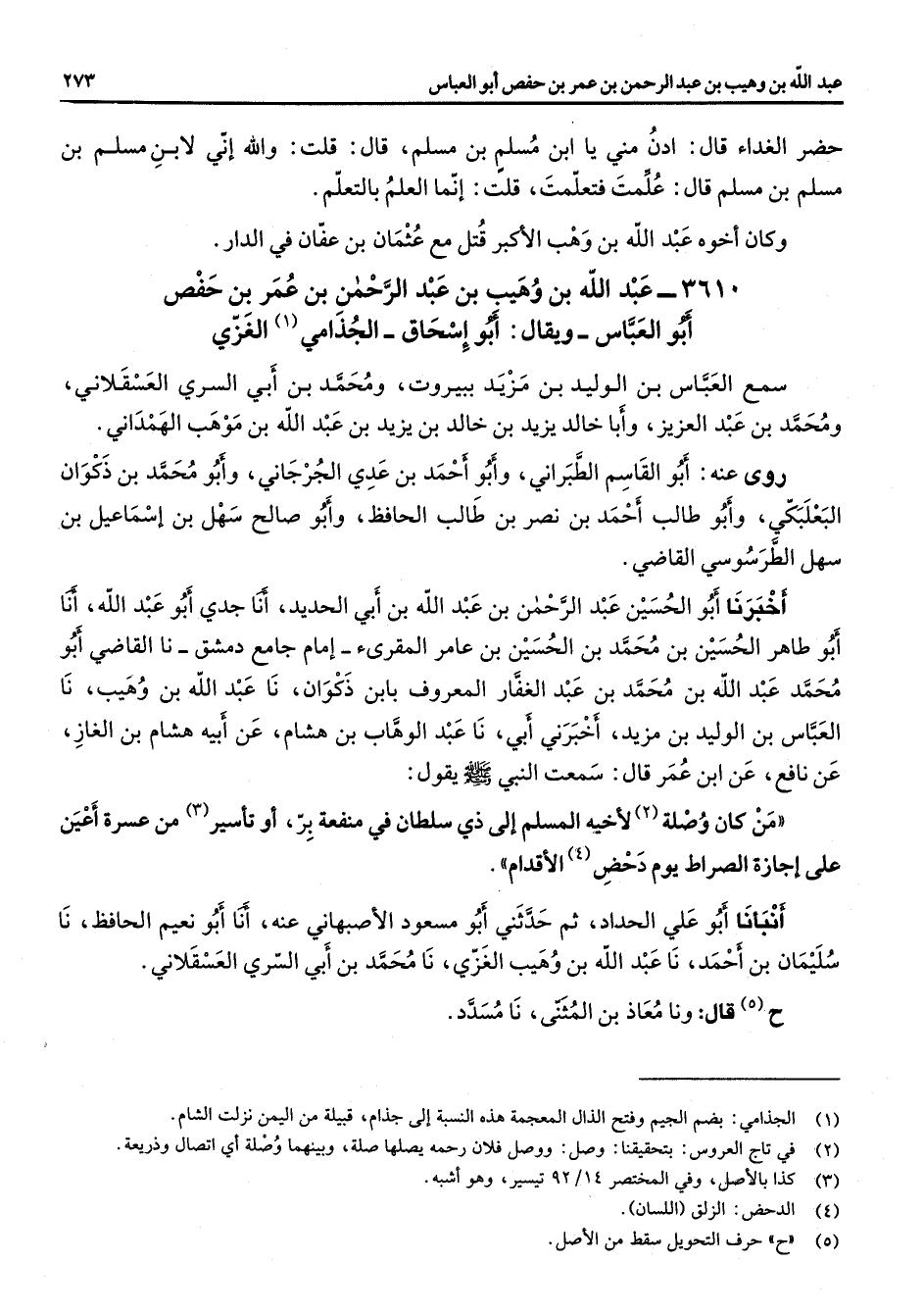 3610 - عبد الله بن وهيب بن عبد الرحمن بن عمر بن حفص أبو العباس ويقال أبو إسحاق الجذامي (1) الغزي سمع العباس بن الوليد بن مزيد ببيروت ومحمد بن أبي السري العسقلاني ومحمد بن عبد العزيز وأبا خالد يزيد بن خالد بن يزيد بن عبد الله بن موهب الهمداني روى عنه أبو القاسم الطبراني وأبو أحمد بن عدي الجرجاني وأبو محمد بن ذكوان البعلبكي وأبو طالب أحمد بن نصر بن طالب الحافظ وأبو صالح سهل بن إسماعيل بن سهل الطرسوسي القاضي أخبرنا أبو الحسين عبد الرحمن بن عبد الله بن أبي الحديد أنا جدي أبو عبد الله أنا أبو طاهر الحسين بن محمد بن الحسين بن عامر المقرئ إمام جامع دمشق نا القاضي أبو محمد عبد الله بن محمد بن عبد الغفار المعروف بابن ذكوان نا عبد الله بن وهيب نا العباس بن الوليد بن مزيد أخبرني أبي نا عبد الوهاب بن هشام عن أبيه هشام بن الغاز عن نافع عن ابن عمر قال سمعت النبي (صلى الله عليه وسلم) يقول من كان وصلة (2) لأخيه المسلم إلى ذي سلطان في منفعة بر أو تأسير (3) من عسرة أعين على إجازة الصراط يوم دحض (4) الأقدام أنبأنا أبو علي الحداد ثم حدثني أبو مسعود الأصبهاني عنه أنا أبو نعيم الحافظ نا سليمان بن أحمد نا عبد الله بن وهيب الغزي نا محمد بن أبي السري العسقلاني ح (5) قال ونا معاذ بن المثنى نا مسدد
