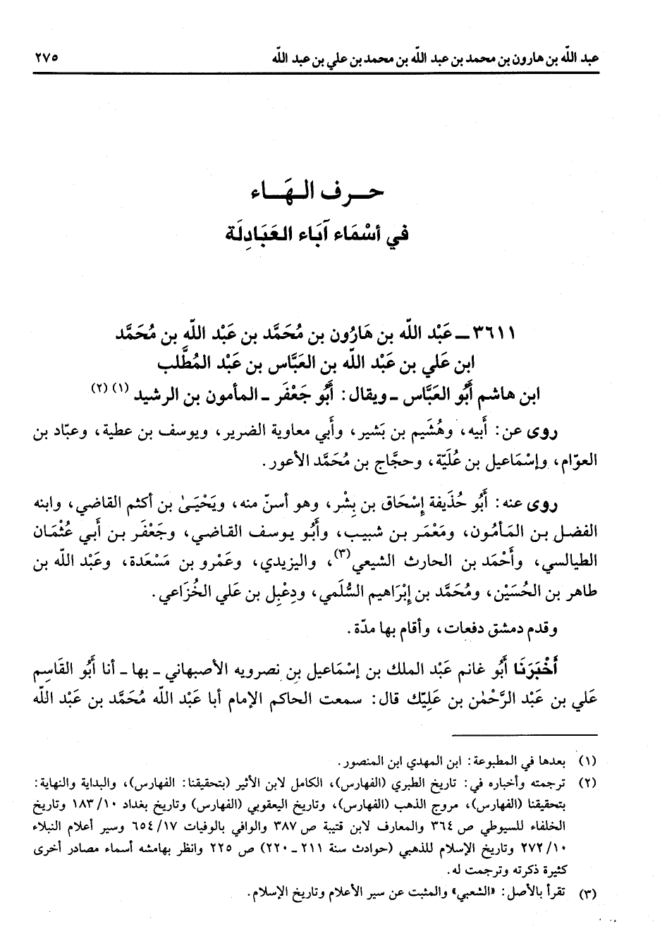 3611 - عبد الله بن هارون بن محمد بن عبد الله بن محمد ابن علي بن عبد الله بن العباس بن عبد المطلب ابن هاشم أبو العباس ويقال أبو جعفر المأمون بن الرشيد (1) (2) روى عن أبيه وهشيم بن بشير وأبي معاوية الضرير ويوسف بن عطية وعباد بن العوام وإسماعيل بن علية وحجاج بن محمد الأعور روى عنه أبو حذيفة إسحاق بن بشر وهو أسن منه ويحيى بن أكثم القاضي وابنه الفضل بن المأمون ومعمر بن شبيب وأبو يوسف القاضي وجعفر بن أبي عثمان الطيالسي وأحمد بن الحارث الشيعي (3) واليزيدي وعمرو بن مسعدة وعبد الله بن طاهر بن الحسين ومحمد بن إبراهيم السلمي ودعبل بن علي الخزاعي وقدم دمشق دفعات وأقام بها مدة أخبرنا أبو غانم عبد الملك بن إسماعيل بن نصرويه الأصبهاني بها أنا أبو القاسم علي بن عبد الرحمن بن عليك قال سمعت الحاكم الإمام أبا عبد الله محمد بن عبد الله