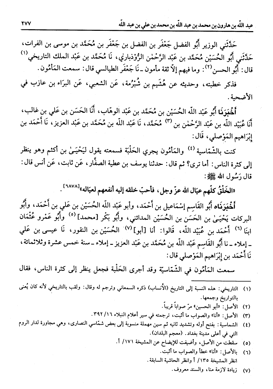 حدثني الوزير أبو الفضل جعفر بن الفضل بن جعفر بن محمد بن موسى بن الفرات حدثني أبو الحسين محمد بن عبد الرحمن الروذباري نا محمد بن عبد الملك التاريخي (1) قال أبو الحسن (2) وما فيهم إلا ثقة مأمون نا جعفر الطيالسي قال سمعت المأمون فذكر خطبته وحديثه عن هشيم بن شبرمة عن الشعبي عن البراء بن عازب في الأضحية أخبرنا أبو عبد الله الحسين بن محمد بن عبد الوهاب أنا الحسن بن علي بن غالب أنا عبيد الله بن عبد الرحمن بن (3) محمد نا عبد الله بن محمد بن عبد العزيز نا أحمد بن إبراهيم الموصلي قال كنت بالشماسية (4) والمأمون يجري الحلبة فسمعته يقول ليحيى بن أكثم وهو ينظر إلى كثرة الناس أما ترى ثم قال حدثنا يوسف بن عطية الصفار عن ثابت عن أنس قال قال رسول الله (صلى الله عليه وسلم) الخلق كلهم عيال الله عز وجل فأحب خلقه إليه أنفعهم لعياله أخبرناه أبو القاسم إسماعيل بن أحمد وأبو عبد الله الحسين بن علي بن أحمد وأبو البركات يحيى بن الحسن بن الحسين المدائني وأبو بكر محمد (5) وأبو عمرو عثمان ابنا (6) أحمد بن عبيد الله قالوا أنا أبو (7) الحسين بن النقور نا عيسى بن علي إملاء نا أبو القاسم عبد الله بن محمد بن عبد العزيز إملاء سنة خمس عشرة وثلاثمائة نا أحمد بن إبراهيم الموصلي قال سمعت المأمون في الشماسية وقد أجرى الحلبة فجعل ينظر إلى كثرة الناس فقال