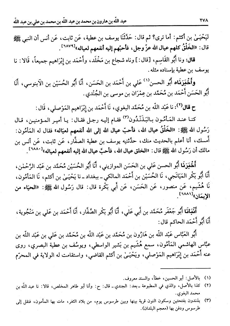 ليحيى بن أكثم أما ترى ثم قال حدثنا يوسف بن عطية عن ثابت عن أنس أن النبي (صلى الله عليه وسلم) قال الخلق كلهم عيال الله عز وجل فأحبهم إليه أنفعهم لعياله قال ونا أبو القاسم قال وناه شجاع بن مخلد وأحمد بن إبراهيم جميعا قالا نا يوسف بن عطية بإسناده مثله وأخبرناه أبو الحسن (1) علي بن أحمد بن الحسن أنا أبو الحسين بن الآبنوسي أنا أبو الحسن أحمد بن محمد بن عمران بن موسى بن الجندي ح (2) قال نا عبد الله بن محمد البغوي نا أحمد بن إبراهيم الموصلي قال كنا عند المأمون بالبذندون (3) فقام إليه رجل فقال يا أمير المؤمنين قال رسول الله (صلى الله عليه وسلم) الخلق عيال الله فأحب عيال الله إلى الله أنفعهم لعياله فقال له المأمون أمسك أنا أعلم بالحديث منك حدثنيه يوسف بن عطية الصفار عن ثابت عن أنس بن مالك أن رسول الله (صلى الله عليه وسلم) قال الخلق عيال الله فأحب عيال الله إليه أنفعهم لعياله أخبرنا أبو الحسن علي بن الحسن الموازيني أنا أبو الحسين محمد بن عبد الرحمن أنا أبو بكر الميانجي نا الحسين بن أحمد المالكي ببغداد نا يحيى بن أكثم نا المأمون نا هشيم عن منصور عن الحسن عن أبي بكرة قال قال رسول الله (صلى الله عليه وسلم) الحياء من الإيمان أنبأنا أبو جعفر محمد بن أبي علي أنا أبو بكر الصفار أنا أحمد بن علي بن منجوية أنا أبو أحمد الحاكم قال أبو العباس عبد الله بن هارون بن محمد بن عبد الله بن محمد بن علي بن عبد الله بن عباس الهاشمي المأمون سمع هشيم بن بشير الواسطي ويوسف بن عطية البصري روى عنه أحمد بن إبراهيم الموصلي ويحيى بن أكثم القاضي واستقامت له الولاية في المحرم