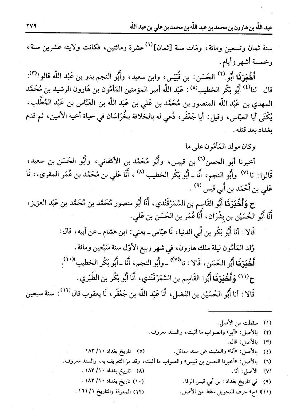سنة ثمان وتسعين ومائة ومات سنة ثمان (1) عشرة ومائتين فكانت ولايته عشرين سنة وخمسة أشهر وأيام أخبرنا أبو (2) الحسن بن قبيس وابن سعيد وأبو النجم بدر بن عبد الله قالوا (3) قال لنا (4) أبو بكر الخطيب (5) عبد الله أمير المؤمنين المأمون بن هارون الرشيد بن محمد المهدي بن عبد الله المنصور بن محمد بن علي بن عبد الله بن العباس بن عبد المطلب يكنى أبا العباس وقيل أبا جعفر دعي له بالخلافة بخراسان في حياة أخيه الأمين ثم قدم بغداد بعد قتله وكان مولد المأمون على ما أخبرنا أبو الحسن (6) بن قبيس وأبو محمد بن الأكفاني وأبو الحسن بن سعيد قالوا نا (7) وأبو النجم أنا أبو بكر الخطيب (8) أنا علي بن محمد بن عمر المقرئ نا علي بن أحمد بن أبي قيس (9) ح وأخبرنا أبو القاسم بن السمرقندي أنا أبو منصور محمد بن محمد بن عبد العزيز أنا أبو الحسين بن بشران أنا عمر بن الحسن بن علي قالا أنا أبو بكر بن أبي الدنيا نا عباس يعني ابن هشام عن أبيه قال ولد المأمون ليلة ملك هارون في شهر ربيع الأول سنة سبعين ومائة أخبرنا أبو الحسن قالا نا (7) وأبو النجم أنا أبو بكر الخطيب (10) ح (11) وأخبرنا أبو القاسم بن السمرقندي أنا أبو بكر بن الطبري قالا أنا أبو الحسين بن الفضل أنا عبد الله بن جعفر نا يعقوب قال (12) سنة سبعين