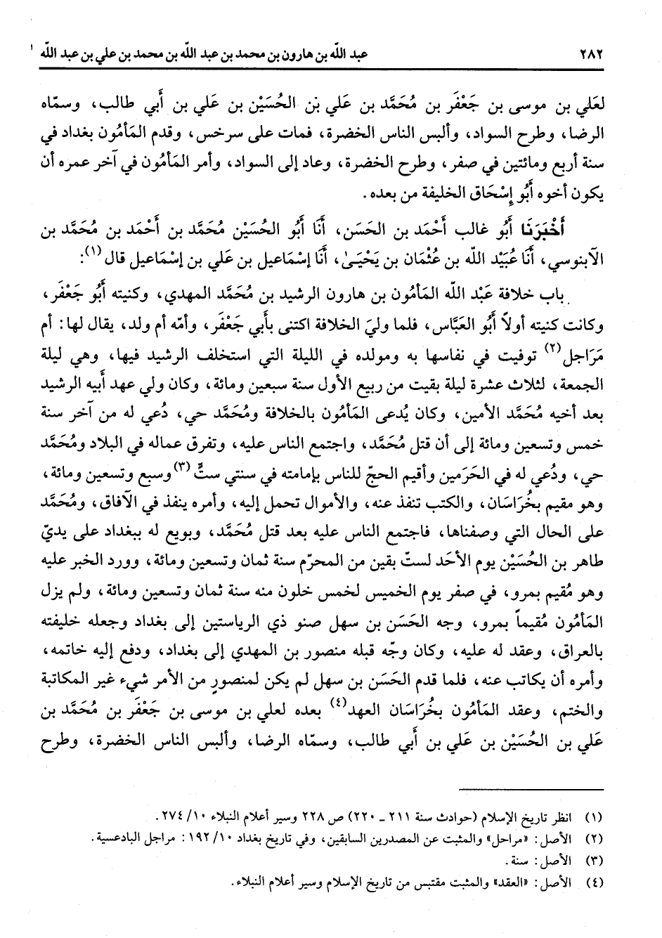 لعلي بن موسى بن جعفر بن محمد بن علي بن الحسين بن علي بن أبي طالب وسماه الرضا وطرح السواد وألبس الناس الخضرة فمات على سرخس وقدم المأمون بغداد في سنة أربع ومائتين في صفر وطرح الخضرة وعاد إلى السواد وأمر المأمون في آخر عمره أن يكون أخوه أبو إسحاق الخليفة من بعده أخبرنا أبو غالب أحمد بن الحسن أنا أبو الحسين محمد بن أحمد بن محمد بن الآبنوسي أنا عبيد الله بن عثمان بن يحيى أنا إسماعيل بن علي ين إسماعيل قال (1) باب خلافة عبد الله المأمون بن هارون الرشيد بن محمد المهدي وكنيته أبو جعفر وكانت كنيته أولا أبو العباس فلما ولى الخلافة اكتنى بأبي جعفر وأمه أم ولد يقال لها أم مراجل (2) توفيت في نفاسها به ومولده في الليلة التي استخلف الرشيد فيها وهي ليلة الجمعة لثلاث عشرة ليلة بقيت من ربيع الأول سنة سبعين ومائة كان ولي عهد أبيه الرشيد بعد أخيه محمد الأمين وكان يدعى المأمون بالخلافة ومحمد حي دعي له من آخر سنة خمس وتسعين ومائة إلى أن قتل محمد واجتمع الناس عليه وتفرق عماله في البلاد ومحمد حي ودعي له في الحرمين وأقيم الحج للناس بإمامته في سنتي ست (3) وسبع وتسعين ومائة وهو مقيم بخراسان والكتب تنفذ عنه والأموال تحمل إليه وأمره ينفذ في الآفاق ومحمد على الحال التي وصفناها فاجتمع الناس عليه بعد قتل محمد وبويع له ببغداد على يدي طاهر بن الحسين يوم الأحد لست بقين من المحرم سنة ثمان وتسعين ومائة وورد الخبر عليه وهو مقيم بمرو في صفر يوم الخميس لخمس خلون منه سنة ثمان وتسعين ومائة ولم يزل المأمون مقيما بمرو وجه الحسن بن سهل صنو ذي الرياستين إلى بغداد وجعله خليفته بالعراق وعقد له عليه وكان وجه قبله منصور بن المهدي إلى بغداد ودفع إليه خاتمه وأمره أن يكاتب عنه فلما قدم الحسن بن سهل لم يكن لمنصور من الأمر شئ غير المكاتبة والختم وعقد المأمون بخراسان العهد (4) بعده لعلي بن موسى بن جعفر بن محمد بن علي بن الحسين بن علي بن أبي طالب وسماه الرضا وألبس الناس الخضرة وطرح
