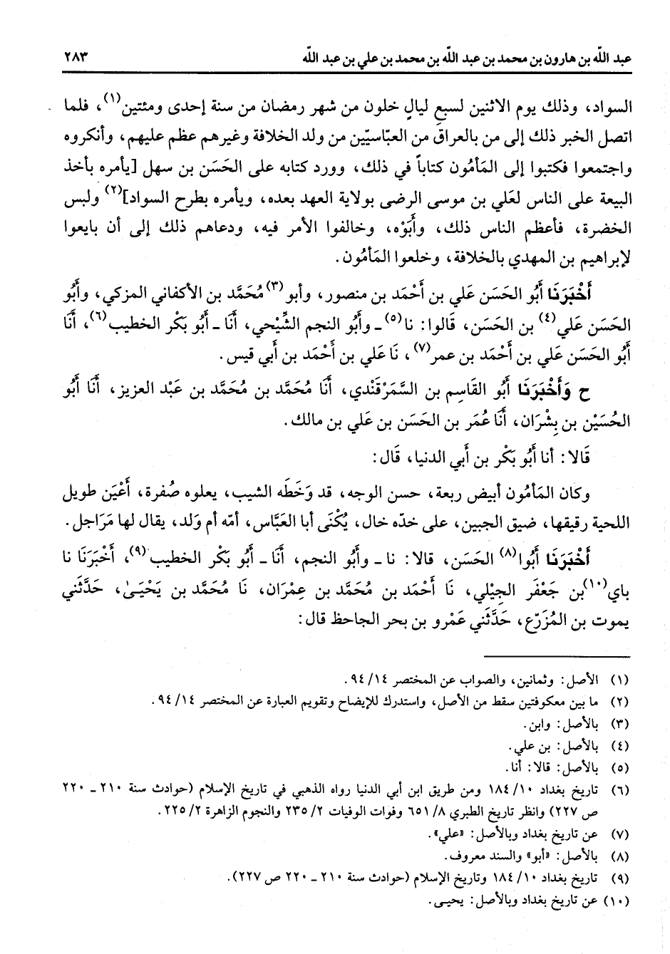 (6) تاريخ بغداد 10 / 184 ومن طريق ابن أبي الدنيا رواه الذهبي في تاريخ الاسلام (حوادث سنة 210 - 220 ص 227) وانظر تاريخ الطبري 8 / 651 وفوات الوفيات 2 / 235 والنجوم الزاهرة 2 / 225