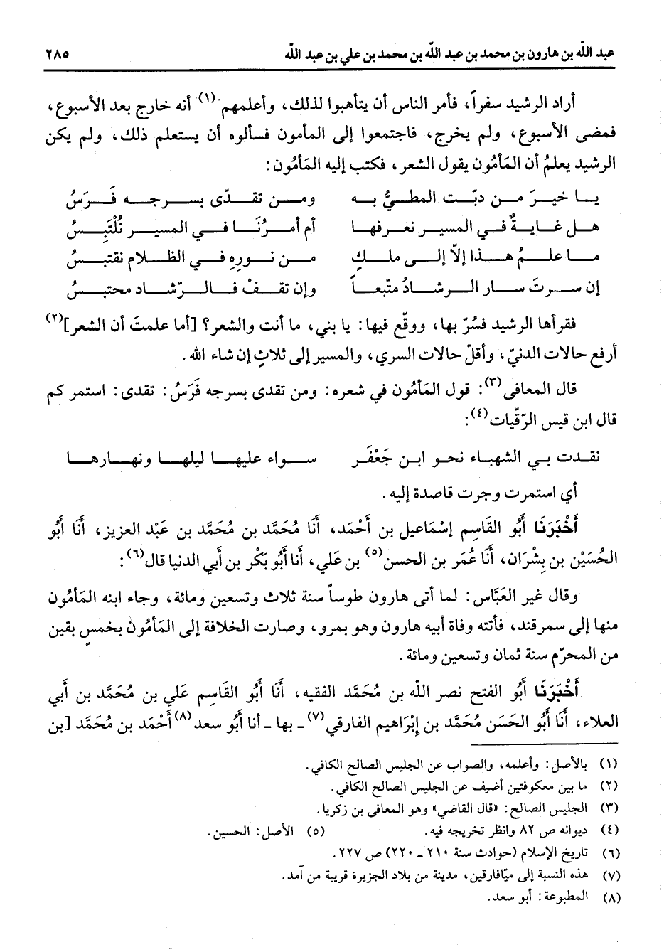 أراد الرشيد سفرا فأمر الناس أن يتأهبوا لذلك وأعلمهم (1) أنه خارج بعد الأسبوع فمضى الأسبوع ولم يخرج فاجتمعوا إلى المأمون فسألوه أن يستعلم ذلك ولم يكن الرشيد يعلم أن المأمون يقول الشعر فكتب إليه المأمون * يا خير من دبت المطئ به * ومن تقدى بسرجه فرس هل غاية في المسير نعرفها * أم أمرنا في المسير نلتبس ما علم هذا إلا إلى ملك * من نوره في الظلام نقتبس إن سرت سار الرشاد متبعا * وإن تقف فالرشاد محتبس * فقرأها الرشيد فسر بها ووقع فيها يا بني ما أنت والشعر أما علمت أن الشعر (2) أرفع حالات الدني واقل حالات السري والمسير إلى ثلاث إن شاء الله قال المعافى (3) قول المأمون في شعره ومن تقد بسرجه فرس تقدى استمر كم قال ابن قيس الرقيات * (4) نقدت بي الشهباء نحو ابن جعفر * سواء عليها ليلها ونهارها * أي استمرت وجرت قاصدة إليه أخبرنا أبو القاسم إسماعيل بن أحمد أنا محمد بن محمد بن عبد العزيز أنا أبو الحسين بن بشران أنا عمر بن الحسن (5) بن علي أنا أبو بكر بن أبي الدنيا قال (6) وقال غير العباس لما أتى هارون طوسا سنة ثلاث وتسعين ومائة وجاء ابنه المأمون منها إلى سمرقند فأتته وفاة أبيه هارون وهو بمرو وصارت الخلافة إلى المأمون بخمس بقين من المحرم سنة ثمان وتسعين ومائة أخبرنا أبو الفتح نصر الله بن محمد الفقيه أنا أبو القاسم علي بن محمد بن أبي العلاء أنا أبو الحسن محمد بن إبراهيم الفارقي (7) بها أنا أبو سعد (8) أحمد بن محمد بن