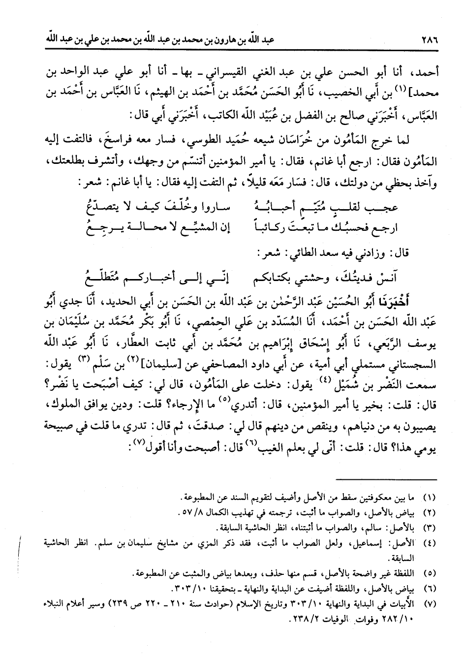 (7) الابيات في البداية والنهاية 10 / 303 وتاريخ الاسلام (حوادث سنة 210 - 220 ص 239) وسير أعلام النبلاء 10 / 282 وفوات الوفيات 2 / 238
