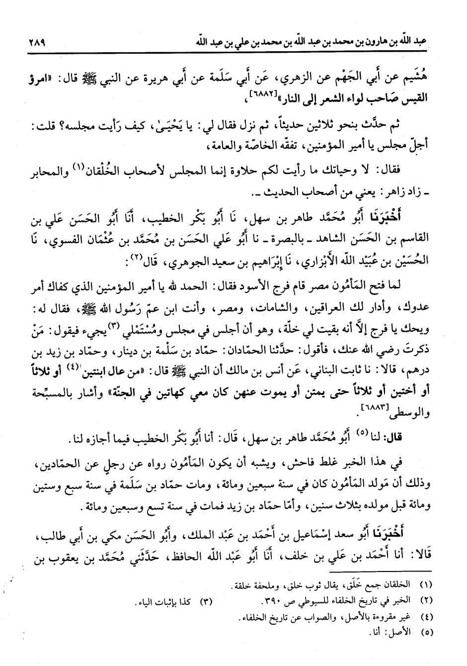 هشيم عن أبي الجهم عن الزهري عن أبي سلمة عن أبي هريرة عن النبي (صلى الله عليه وسلم) قال امرؤ القيس صاحب لواء الشعر إلى النار ثم حدث بنحو ثلاثين حديثا ثم نزل فقال لي يا يحيى كيف رأيت مجلسه قلت أجل مجلس يا أمير المؤمنين تفقه الخاصة والعامة فقال لا وحياتك ما رأيت لكم حلاوة إنما المجلس لأصحاب الخلقان (1) والمحابر زاد زاهر يعني من أصحاب الحديث أخبرنا أبو محمد طاهر بن سهل نا أبو بكر الخطيب أنا أبو الحسن علي بن القاسم بن الحسن الشاهد بالبصرة نا أبو علي الحسن بن محمد بن عثمان الفسوي نا الحسين بن عبيد الله الأبزاري نا إبراهيم بن سعيد الجوهري قال (2) لما فتح المأمون مصر قام فرج الأسود فقال الحمد لله يا أمير المؤمنين الذي كفاك أمر عدوك وأدار لك العراقين والشامات ومصر وأنت ابن عم رسول الله (صلى الله عليه وسلم) فقال له ويحك يا فرج إلا أنه بقيت لي خلة وهو أن أجلس ومستملي (3) يجئ فيقول من ذكرت Bك فأقول حدثنا الحمادان حماد بن سلمة بن دينار وحماد بن زيد بن درهم قالا نا ثابت البناني عن أنس بن مالك أن النبي (صلى الله عليه وسلم) قال من عال ابنتين (4) أو ثلاثا أو أختين أو ثلاثا حتى يمتن أو يموت عنهن كان معي كهاتين في الجنة وأشار بالمسبحة والوسطى قال لنا (5) أبو محمد طاهر بن سهل قال أنا أبو بكر الخطيب فيما أجازه لنا في هذا الخبر غلط فاحش ويشبه أن يكون المأمون رواه عن رجل عن الحمادين وذلك أن مولد المأمون كان في سنة سبعين ومائة ومات حماد بن سلمة في سنة سبع وستين ومائة قبل مولده بثلاث سنين وأما حماد بن زيد فمات في سنة تسع وسبعين ومائة أخبرنا أبو سعد إسماعيل بن أحمد بن عبد الملك وأبو الحسن مكي بن أبي طالب قالا أنا أحمد بن علي بن خلف أنا أبو عبد الله الحافظ حدثني محمد بن يعقوب بن