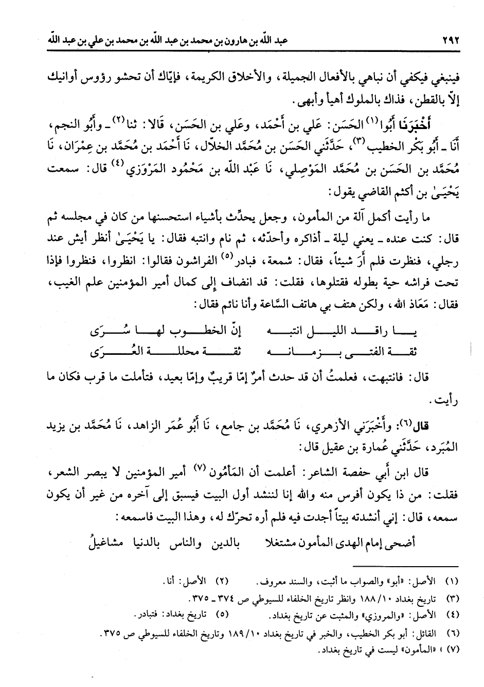 (6) القائل: أبو بكر الخطيب والخبر في تاريخ بغداد 10 / 189 وتاريخ الخلفاء للسيوطي ص 375