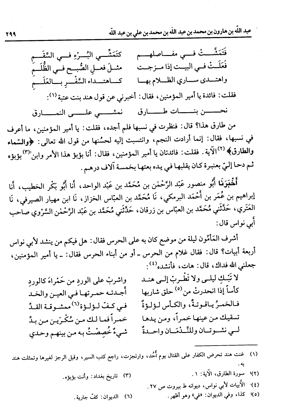 فتمشت في مفاصلهم * كتمشي البرء في السقم فعلت في البيت إذا مزجت * مثل فعل الصبح في الظلم واهتدى ساري الظلام بها * كاهتداء السفر بالعلم * فقلت فائدة يا أمير المؤمنين فقال أخبرني عن قول هند بنت عتبة * (1) نحن بنات طارق * نمشي على النمارق * من طارق هذا قال فنظرت في نسبها فلم أجده فقلت يا أمير المؤمنين ما أعرف في نسب فقال إنما أرادت النجم وانتسبت إليه لحسنها من قول الله تعالى " والسماء والطارق " (2) الآية فقلت فائدتان يا أمير المؤمنين فقال أنا بؤبؤ هذا الأمر وابن (3) بؤبؤه ثم دحا إلي بعنبرة كان يقلبها في يده بعتها بخمسة آلاف درهم أخبرنا أبو منصور عبد الرحمن بن محمد بن عبد الواحد أنا أبو بكر الخطيب أنا إبراهيم بن عمر بن أحمد البرمكي نا محمد بن العباس الخزاز نا ابن مهيار الصيرفي نا العتري حدثني محمد بن العباس بن زرقان حدثني محمد بن عبد الرحمن السروي صاحب أبي نواس قال أشرف المأمون ليلة من موضع كان به على الحرس فقال هل فيكم من ينشد لأبي نواس أربعة أبيات قال فقال غلام من الحرس أو من أبناء الحرس فقال يا أمير المؤمنين جعلني الله فداك قال هات فأنشده * (4) لا تبك ليلى ولا تطرب إلى هند * واشرب على الورد من حمراء كالورد كأسا إذا انحدرت من (5) حلق شاربها * أجدته حمرتها في العين والخد فالخمر ياقوتة والكأس لؤلؤة * في كف لؤلؤة (6) ممشوقة القد تسقيك من عينها خمرا ومن يدها * خمرا فما لك من سكرين من بد لي نشوتان وللندمان واحدة * شئ خصصت به من بينهم وحدي *