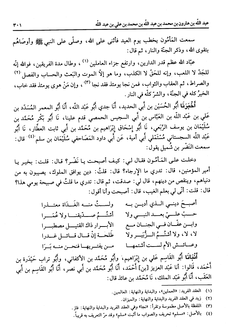 سمعت المأمون يخطب يوم العيد فأثنى على الله وصلى على النبي (صلى الله عليه وسلم) وأوصاهم بتقوى الله وذكر الجنة والنار ثم قال عباد الله عظم قدر الدارين وارتفع جزاء العاملين (1) وطال مدة الفريقين فو الله إنه للجد لا اللعب وإنه للحق لا الكذب وما هو إلا الموت والعبث والحساب والفصل (2) والصراط ثم العقاب والثواب فمن نجا يومئذ فقد نجا (3) وإن من هوى يومئذ فقد خاب الخير كله في الجنة والشر كله في النار أخبرنا أبو الحسين بن أبي الحديد أنا جدي أبو عبد الله أنا أبو المعمر المسدد بن علي بن عبد الله بن العباس بن أبي السجيس الحمصي قدم علينا نا أبو بكر محمد بن سليمان بن يوسف الربعي نا أبو إسحاق إبراهيم بن محمد بن أبي ثابت العطار نا أبو عبد الله السجستاني مستملي أبي أمية عن أبي داود المصاحفي سليمان بن سلم (4) قال سمعت النضر بن شميل يقول دخلت على المأمون فقال لي كيف أصبحت يا نضر قال قلت بخير يا أمير المؤمنين قال تدري ما الإرجاء قال قلت دين يوافق الملوك يصيبون به من دنياهم وينقص من دينهم قال لي صدقت ثم قال تدري ما قلت في صبيحة يومي هذا قال قلت أنى لي بعلم الغيب قال أصبحت وأنا أقول * أصبح ديني الذي أدين به * ولست منه الغداة معتذرا حب علي بعد النبي ولا * أشتم صديقنا ولا عمرا وابن عفان في الجنان مع * الأبرار ذاك القتيل مصطبرا لا لا ولا أشتم الزبير ولا * طلحة إن قال قائل غدرا وعائش الأم لست أشتمها * من يفتريها فنحن منه برا * أنبأنا أبو القاسم علي بن إبراهيم وأبو محمد بن الأكفاني وأبو تراب حيدرة بن أحمد قالوا أنا عبد العزيز بن أحمد أنا أبو محمد بن أبي نصر أنا أبو القاسم بن أبي العقب أنا أبو عبد الملك نا محمد بن عائذ قال