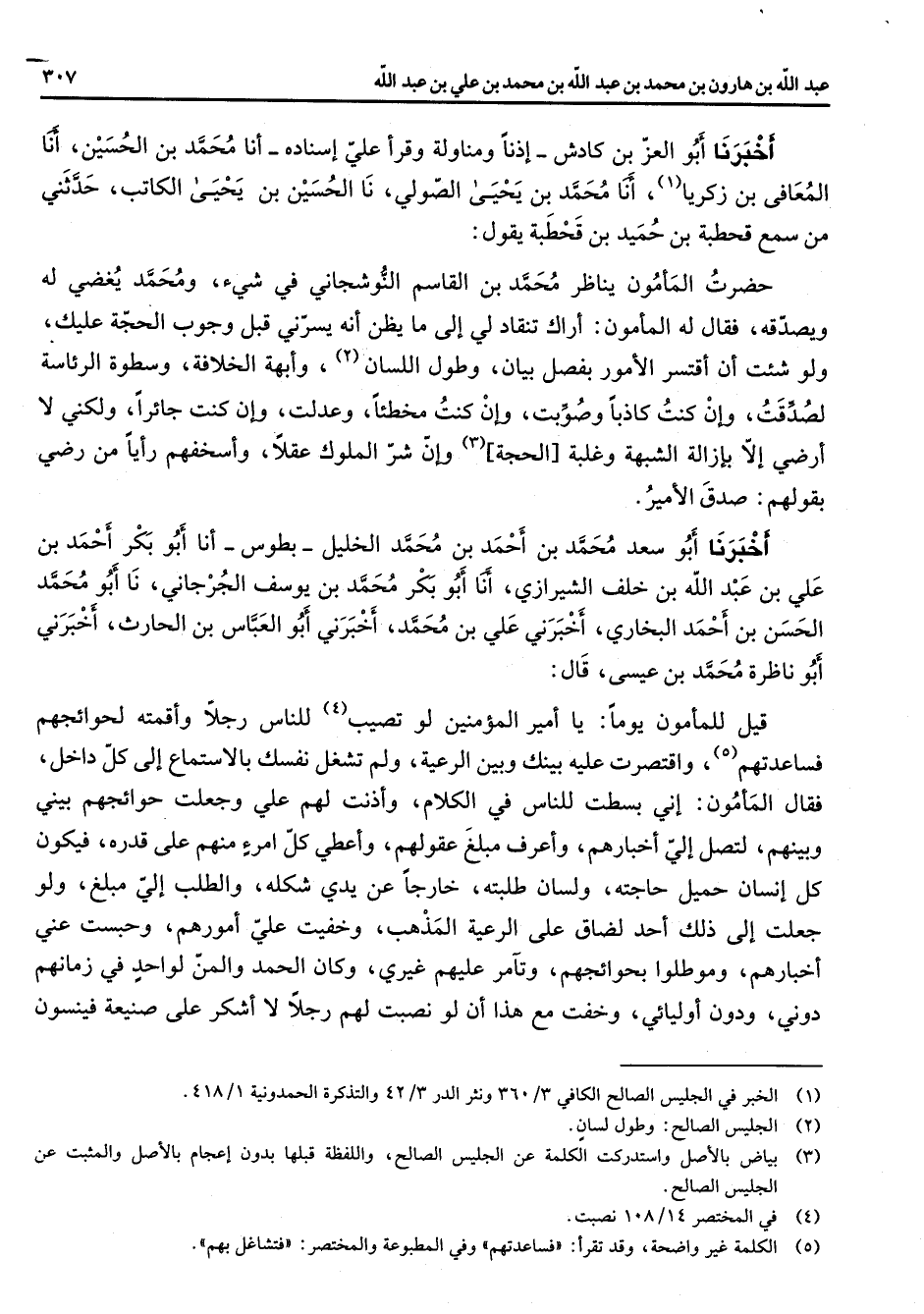 أخبرنا أبو العز بن كادش إذنا ومناولة وقرأ علي إسناده أنا محمد بن الحسين أنا المعافى بن زكريا (1) أنا محمد بن يحيى الصولي نا الحسين بن يحيى الكاتب حدثني من سمع قحطبة بن حميد بن قحطبة يقول حضرت المأمون يناظر محمد بن القاسم النوشجاني في شوئ محمد يغضي له ويصدقه فقال له المأمون أراك تنقاد لي إلى ما يظن أنه يسرني قبل وجوب الحجة عليك ولو شئت أن أقتسر الأمور بفصل بيان وطول اللسان (2) روأبهة الخلافة وسطوة الرئاسة لصدقت وإن كنت كاذبا وصوبت وإن كنت مخطئا وعدلت وإن كنت جائرا ولكني لا أرضي إلا بإزالة الشبهة وغلبة الحجة (3) وإن شر الملوك عقلا وأسخفهم رأيا من رضي بقولهم صدق الأمير أخبرنا أبو سعد محمد بن أحمد بن محمد الخليل بطوس أنا أبو بكر أحمد بن علي بن عبد الله بن خلف الشيرازي أنا أبو بكر محمد بن يوسف الجرجاني نا أبو محمد الحسن بن أحمد البخاري أخبرني علي بن محمد أخبرني أبو العباس بن الحارث أخبرني أبو ناظرة محمد بن عيسى قال قيل للمأمون يوما يا أمير المؤمنين لو تصيب (4) للناس رجلا وأقمته لحوائجهم فساعدتهم (5) واقتصرت عليه بينك وبين الرعية ولم تشغل نفسك بالاستماع إلى كل داخل فقال المأمون إني بسطت للناس في الكلام وأذنت لهم علي وجعلت حوائجهم بيني وبينهم لتصل إلي أخبارهم وأعرف مبلغ عقولهم وأعطي كل امرء منهم على قدره فيكون كل إنسان حميل حاجته ولسان طلبته خارجا عن يدي شكله والطلب إلي مبلغ ولو جعلت إلى ذلك أحد لضاق على الرعية المذهب وخفيت علي أمورهم وحبست عني أخبارهم وموطلوا بحوائجهم وتآمر عليهم غيري وكان الحمد والمن لواحد في زمانهم دوني ودون أوليائي وخفت مع هذا أن لو نصبت لهم رجلا لا أشكر على صنيعة فينسون