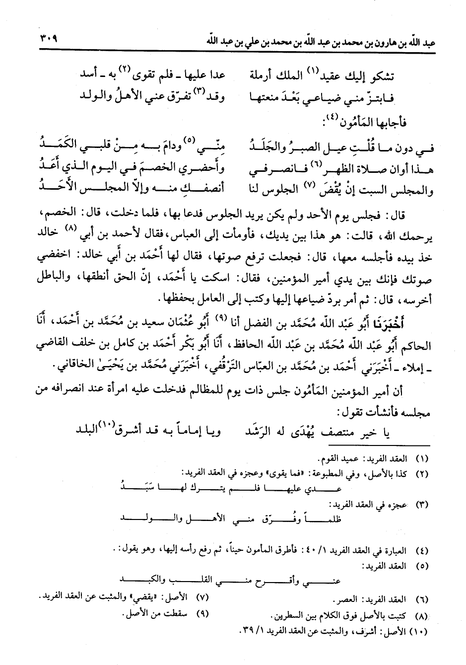 (2) كذا بالاصل وفي المطبوعة: " فما يقوى " وعجزه في العقد الفريد: عدي عليها فلم يترك لها سبد (3) عجزه في العقد الفريد: ظلما وفرق مني الاهل والولد (4) العبارة في العقد الفريد 1 / 40: فأطرق المأمون حينا ثم رفع رأسه إليها وهو يقول: (5) العقد الفريد: عني وأقرح مني القلب والكبد (6) العقد الفريد: العصر