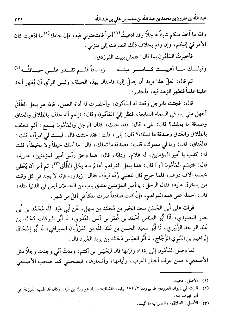والله ما آخذ منكم شيئا عاجلا وقد ادعيت (1) أمرا فامتحنوني فيه فإن جاءك ما ادعيت كان الأمر في إليكم وإن وقع بخلاف ذلك انصرفت إلى منزلي فأخبرت المأمون بما قال فتمثل ببيت الفرزدق * وقبلك ما أعييت كاسر عينه * زيادا فلم تقدر علي حبائله (2) * ثم قال لعل هذا يريد أن يصل إلينا فاحتال بهذه الحيلة وليس الرأي أن يظهر أحد علينا علما فنظهر الزهد فيه فأحضره قال فجئت بالرجل وقعد له المأمون وأحضرت له أداة العمل فإذا هو يحل الطلق أجهل مني بما في السماء السابعة فنظر إلي المأمون وقال تزعم أنه حلف بالطلاق والعتاق وصدقة ما يملك قال بلى قال فقد حنث فقال الرجل والمأمون يسمع ألم تحلف بالطلاق والعتاق وصدقة ما تملك قال بلى قلت فقد حنثت قال ليست لي امرأة قلت فالعتاق قال وما لي مملوك قلت فصدقة ما تملك قال ما أملك خيطا ولا مخيطا قلت له كذب يا أمير المؤمنين له غلام ودابة قال هما وحق رأس أمير المؤمنين عارية قال فتبسم المأمون وقال هذا بحل الدراهم أعلم منه بحل الطلق (3) ثم أمر أن يعطى خمسة آلاف درهم فلما خرج قال للعتبي رده فرده فقال زيدوه فإنه لا يجد في كل وقت من يمخرق عليه فقال الرجل يا أمير المؤمنين عندي باب من الحملان ليس في الدنيا مثله قال احمله على هذه الدراهم فإن كنت صادقا صرت ملكا في أقل من شهر قرأت على أبي الحسن سعد الخير بن محمد بن سهل عن أبي عبد الله محمد بن أبي نصر الحميدي أنا أبو العباس أحمد بن عمر بن أنس العذري نا أبو البركات محمد بن عبد الواحد الزبيري نا أبو سعيد الحسن بن عبد الله المرزبان السيرافي نا أبو إسحاق إبراهيم بن السري الزجاج نا أبو العباس محمد بن يزيد المبرد قال لما وصل المأمون إلى بغداد وقربها قال ليحيى بن أكثم وددت أني وجدت رجلا مثل الأصمعي ممن عرف أخبار العرب وأيامها وأشعارها فيصحبني كما صحب الأصمعي