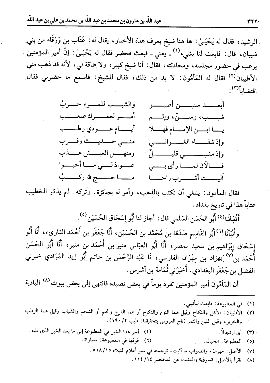 الرشيد فقال له يحيى ها هنا شيخ يعرف هذه الأخبار يقال له عتاب بن ورقاء من بني شيبان قال فابعث لنا بشئ (1) يعني فبعث فحضر فقال له يحيى إن أمير المؤمنين يرغب في حضور مجلسه ومحادثته فقال أنا شيخ كبير ولا طاقة لي لأنه قد ذهب مني الأطيبان (2) فقال له المأمون لا بد من ذلك فقال للشيخ فاسمع ما حضرني فقال اقتضابا (3) * أبعد ستين أصبو * والشيب للمرء حرب شيب وسن وإثم * أمر لعمرك صعب يا ابن الإمام فهلا * أيام عودي رطب وإذ شفاء الغواني * مني حديث وقرب وإذ مشيبي قليل * ومنهل العيش عذب فالآن لما رأى بي * عواذ لي ما أحبوا آليت أشرب راحا * ما حج لله ركب * فقال المأمون ينبغي أن تكتب بالذهب وأمر له بجائزة وتركه لم يذكر الخطيب عتابا هذا في تاريخ بغداد أنبأنا (4) أبو الحسن السلمي قال أجاز لنا أبو إسحاق الحسين (5) وأنبأنا (6) أبو القاسم صدقة بن محمد بن الحسين أنا جعفر بن أحمد القارئ أنا أبو إسحاق إبراهيم بن سعيد بمصر أنا أبو العباس منير بن أحمد بن منير أنا أبو الحسن أحمد بن (7) بهزاد بن مهران الفارسي نا عبد الرحمن بن حاتم أبو زيد المرادي خبرني الفضل بن جعفر البغدادي أخبرني ثمامة بن أشرس أن المأمون أمير المؤمنين تفرد يوما في بعض تصيده فانتهى إلى بعض بيوت (8) البادية