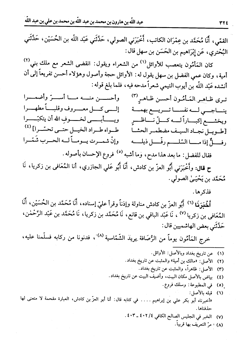 القمي أنا محمد بن عمران الكاتب أخبرني الصولي حدثني عبد الله بن الحسين حدثني البحتري عن إبراهيم بن الحسن بن سهل قال كان المأمون يتعصب للأوائل (1) من الشعراء ويقول انقضى الشعر مع ملك بني (2) أمية وكان عمي الفضل بن سهل يقول له الأوائل حجة وأصول وهؤلاء أحسن تفريعا إلى أن أنشده عبد الله بن أيوب التيمي شعرا مدحه فيه فلما بلغ قوله * ترى ظاهر المأمون أحسن ظاهر (3) * وأحسن منه ما أسر وأضمرا يناجي له نفسا تريع بهمة * إلى كل معروف وقلبا مطهرا ويخشع إكبارا له كل ناظر * ويأبى لخوف الله أن يتكبرا طويل نجاد السيف مضطمر الحشا * طواه طراد الخيل حتى تحسرا (4) رفل إذا ما السلم رفل ذيله * وإن شمرت يوما له الحرب شمرا * فقال للفضل ما بعد هذا مدح وما أشبه (5) فروع الإحسان بأصوله ح وقال وأخبرني أبو العز بن كادش أنا أبو علي الجازري أنا المعافى بن زكريا نا محمد بن يحيى الصولي فذكرها أخبرنا (6) أبو العز بن كادش مناولة وإذنا وقرأ علي إسناده أنا محمد بن الحسين أنا المعافى بن زكريا (7) نا عبد الباقي بن قانع نا محمد بن زكريا نا محمد بن عبد الرحمن حدثني بعض الهاشميين قال خرج المأمون يوما من الرصافة يريد الشماسية (8) فدنونا من ركابه فسلمنا عليه