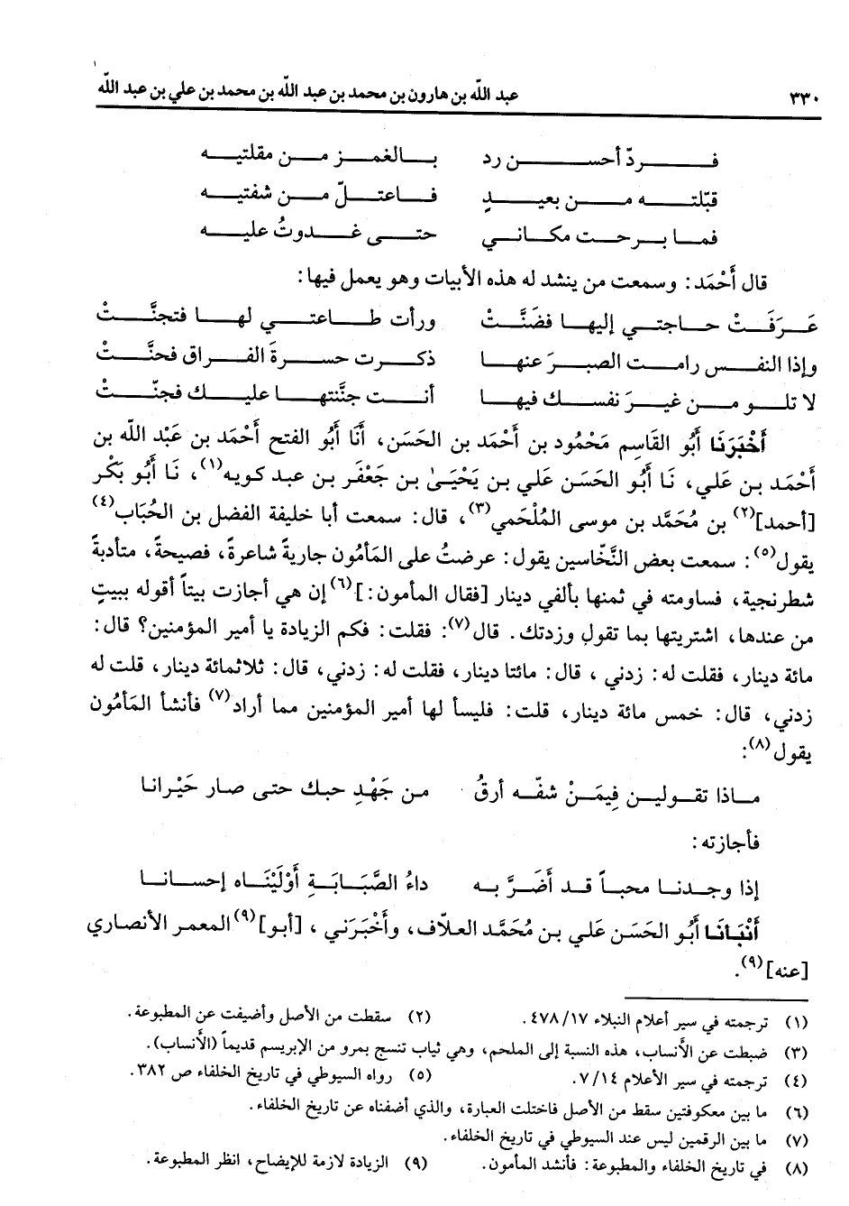 فرد أحسن رد * بالغمز من مقلتيه قبلته من بعيد * فاعتل من شفتيه فما برحت مكاني * حتى غدوت عليه * قال أحمد وسمعت من ينشد له هذه الأبيات وهو يعمل فيها * عرفت حاجتي إليها فضنت * ورأت طاعتي لها فتجنت وإذا النفس رامت الصبر عنها * ذكرت حسرة الفراق فحنت لا تلو من غير نفسك فيها * أنت جننتها عليك فجنت * أخبرنا أبو القاسم محمود بن أحمد بن الحسن أنا أبو الفتح أحمد بن عبد الله بن أحمد بن علي نا أبو الحسن علي بن يحيى بن جعفر بن عبد كويه (1) نا أبو بكر أحمد (2) بن محمد بن موسى الملحمي (3) قال سمعت أبا خليفة الفضل بن الحباب (4) يقول (5) سمعت بعض النخاسين يقول عرضت على المأمون جارية شاعرة فصيحة متأدبة شطرنجية فساومته في ثمنها بألفي دينار فقال المأمون (6) إن هي أجازت بيتا أقوله ببيت من عندها اشتريتها بما تقول وزدتك قال (7) فقلت فكم الزيادة يا أمير المؤمنين قال مائة دينار فقلت له زدني قال مائتا دينار فقلت له زدني قال ثلاثمائة دينار قلت له زدني قال خمس مائة دينار قلت فليسأ لها أمير المؤمنين مما أراد (7) فأنشأ المأمون يقول (8) * ماذا تقولين فيمن شفه أرق * من جهد حبك حتى صار حيرانا * فأجازته إذا وجدنا محبا قد أضر به * داء الصبابة أوليناه إحسانا * أنبأنا أبو الحسن علي بن محمد العلاف وأخبرني أبو (9) المعمر الأنصاري عنه (9)