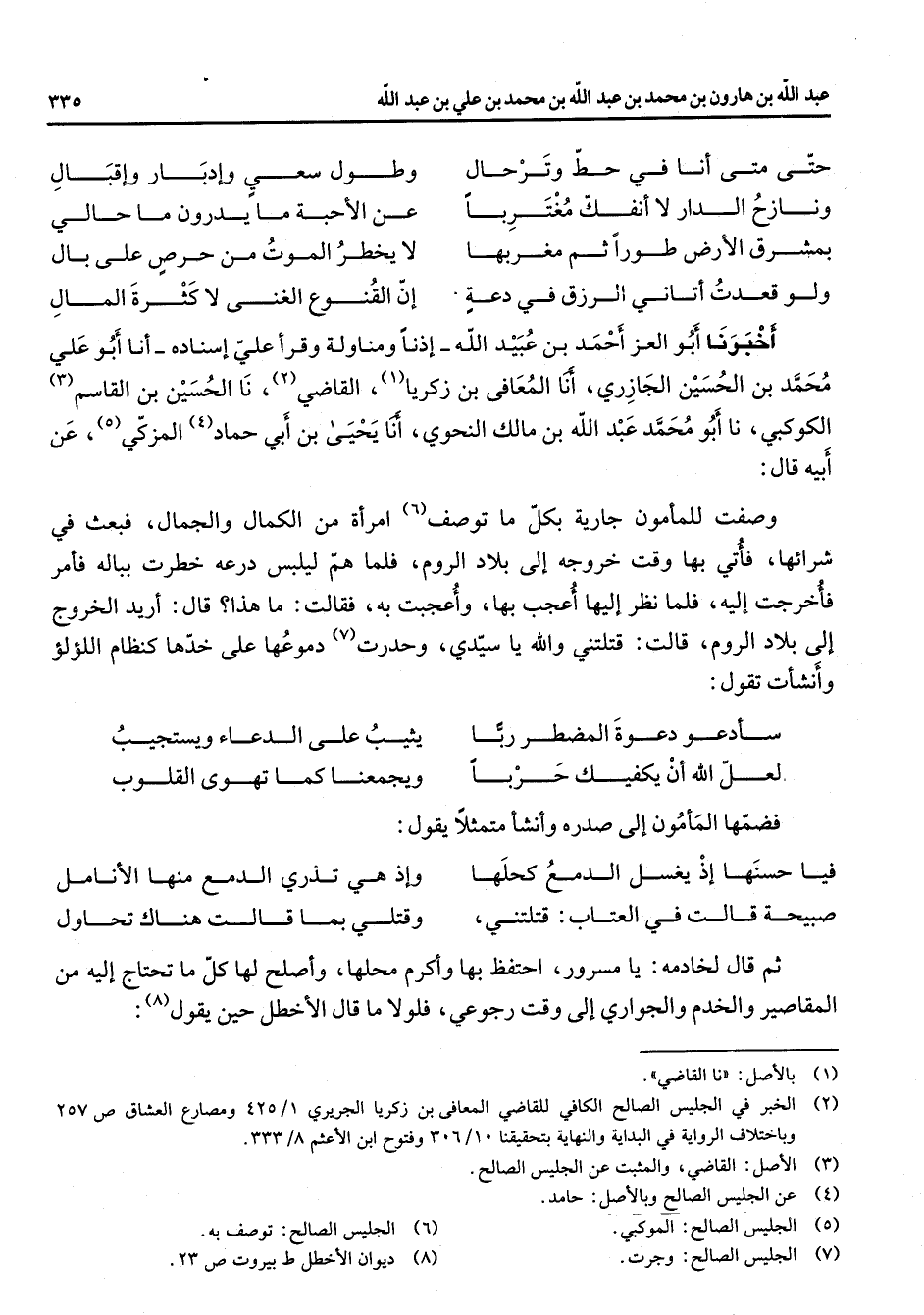 حتى متى أنا في حط وترحال * وطول سعي وإدبار وإقبال * * ونازح الدار لا أنفك مغتربا * عن الأحبة ما يدرون ما حالي بمشرق الأرض طورا ثم مغربها * لا يخطر الموت من حرص على بال * * ولو قعدت أتاني الرزق في دعة * إن القنوع الغنى لا كثرة المال * أخبرنا أبو العز أحمد بن عبيد الله إذنا ومناولة وقرأ علي إسناده أنا أبو علي محمد بن الحسين الجازري أنا المعافى بن زكريا (1) القاضي (2) نا الحسين بن القاسم (3) الكوكبي نا أبو محمد عبد الله بن مالك النحوي أنا يحيى بن أبي حماد (4) المزكي (5) عن أبيه قال وصفت للمأمون جارية بكل ما توصف (6) امرأة من الكمال والجمال فبعث في شرائها فأتي بها وقت خروجه إلى بلاد الروم فلما هم ليلبس درعه خطرت بباله فأمر فأخرجت إليه فلما نظر إليها أعجب بها وأعجبت به فقالت ما هذا قال أريد الخروج إلى بلاد الروم قالت قتلني والله يا سيدي وحدرت (7) دموعها على خدها كنظا اللؤلؤ وأنشأت تقول * سأدعو دعوة المضطر ربا * يثيب على الدعاء ويستجيب لعل الله أن يكفيك حربا * ويجمعنا كما تهوى القلوب * فضمها المأمون إلى صدره وأنشأ متمثلا يقول * فيا حسنها إذ يغسل الدمع كحلها * وإذ هي تذري الدمع منها الأنامل صبيحة قالت في العتاب قتلتني * وقتلي بما قالت هناك تحاول * ثم قال لخادمه يا مسرور احتفظ بها وأكرم محلها وأصلح لها كل ما تحتاج إليه من المقاصير والخدم والجواري إلى وقت رجوعي فلولا ما قال الأخطل حين يقول (8)