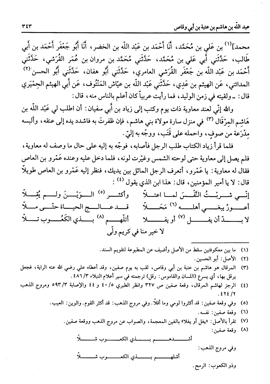 محمد (1) بن علي بن محمد أنا أحمد بن عبد الله بن الخضر أنا أبو جعفر أحمد بن أبي طالب حدثني أبي علي بن محمد حدثني محمد بن مروان بن عمر القرشي حدثني أحمد بن عبد الله بن جعفر القرشي العامري حدثني أبو هفان حدثني أبو الحسن (2) المدائني عن الهيثم بن عدي حدثني عبد الله بن عياش المنتوف عن أبي الهيثم الحميري قال ولقيته في زمن الوليد فما رأيت عربيا كان أعلم بالناس منه قال والله إني لعند معاوية ذات يوم وكتب إلى زياد بن أبي سفيان أن اطلب لي عبد الله بن هاشم المرقال (3) في منزل سارة مولاة بني هاشم فإن ظفرت به فاشدد يده إلى عنقه وألبسه مدرعة من صوف واحمله على قتب ووجه به إلي فلما قرأ زياد الكتاب طلب الرجل فأصابه فوجه به إليه على حال وصف له معاوية فلم يصل إلى معاوية حتى لوحته الشمس وغيرت لونه فلما دخل عليه وعنده عمرو بن العاص فقال له معاوية يا عمرو أتعرف الرجل الماثل بين يديك فنظر إليه عمرو بن العاص طويلا قال لا يا أمير المؤمنين قال هذا ابن الذي يقول (4) * إني شربت النفس لما اعتلا * وأكثر (5) الوين ولم يقلا أعور يبغي أهله (6) محلا * قد عالج الحياة حتى ملا لا بد أن يفل (7) أو يفلا * أتلهم (8) بذي الكعوب تلا لا خير منا في كريم ولى