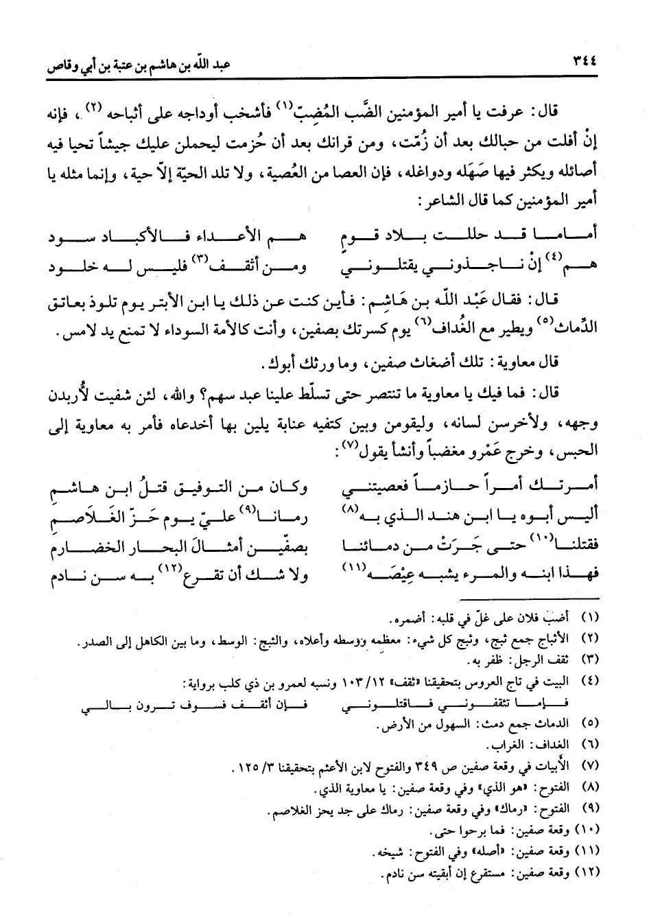 قال عرفت يا أمير المؤمنين الضب المضب (1) فأشخب أوداجه على أثباحه (2) فإنه إن أفلت من حبالك بعد أن زمت ومن قرانك بعد أن حزمت ليحملن عليك جيشا تحيا فيه أصائلة ويكثر فيها صهله ودواغله فإن العصا من العصية ولا تلد الحية إلا حية وإنما مثله يا أمير المؤمنين كما قال الشاعر * أماما قد حللت بلاد قوم * هم الأعداء فالأكباد سود هم (4) إن ناجذوني يقتلوني * ومن أثقف (3) فليس له خلود * قال فقال عبد الله بن هاشم فأين كنت عن ذلك يا ابن الأبتر يوم تلوذ بعاتق الدماث (5) ويطير مع الغداف (6) يوم كسرتك بصفين وأنت كالأمة السوداء لا تمنع يد لامس قال معاوية تلك أضغاث صفين وما ورثك أبوك قال فما فيك يا معاوية ما تنتصر حتى تسلط علينا عبد سهم والله لئن شفيت لأريدن وجهه ولأخرسن لسانه وليقومن وبين كتفيه عنابة يلين بها أخدعاه فأمر به معاوية إلى الحبس وخرج عمرو مغضبا وأنشأ يقول (7) * أمرتك أمرا حازما فعصيتني * وكان من التوفيق قتل ابن هاشم أليس أبوه يا ابن هند الذي به (8) * رمانا (9) علي يوم حز الغلاصم فقتلنا (10) حتى جرت من دمائنا * بصفين أمثال البحار الخضارم فهذا ابنه والمرء يشبه عيصه (11) * ولا شك أن تقرع (12) به سن نادم