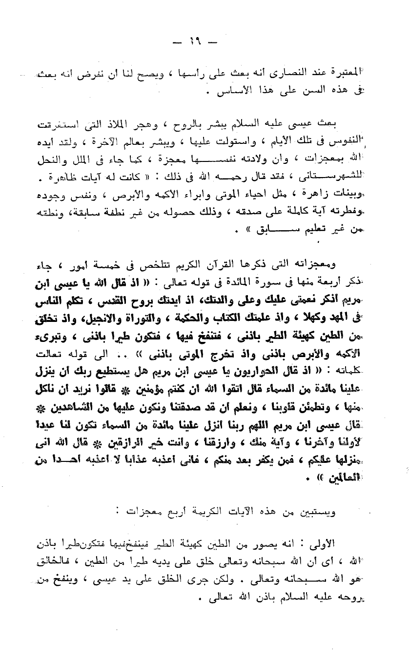 بعث عيسى عليه السلام يبشر بالروح. وعجز الملاذ التي استغرقت النفوس في تلك الأيام، واستولت عليها، ويبشر بعالم الآخرة، ولقد أيده الله بمعجزات، وأن ولادته نفسها معجزة، كما جاء في الملل والنحل للشهرستاني، فقد قال - رحمه الله - في ذلك: "كانت له آيات ظاهرة. وبينات زاهرة، مثل أحياء الموتى وإبراء الأكمة والأبرص، ونفس وجوده وفطرته آية كاملة على صدقه، وذلك حصوله من غير نطفة سابقة، ونعلقه من غير تعليم سابق".