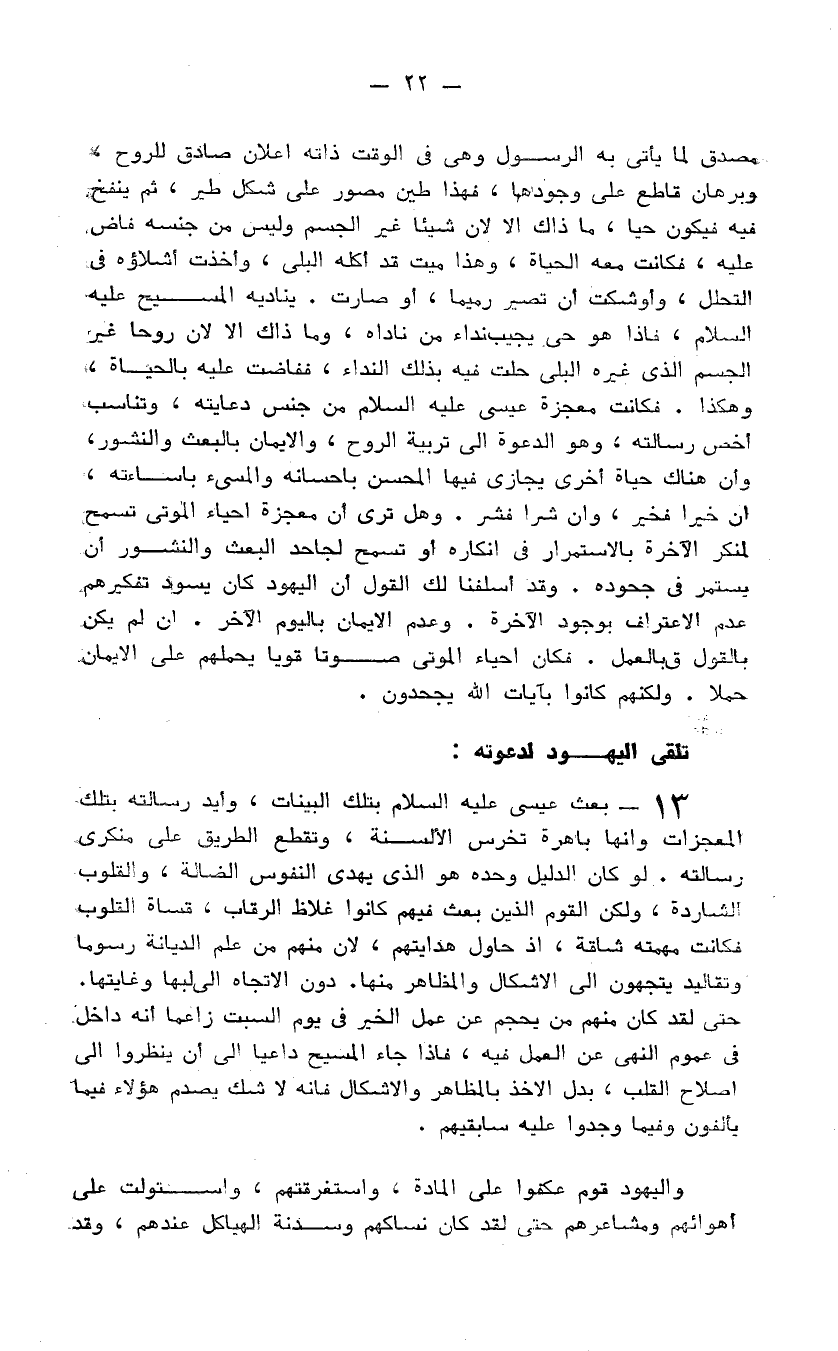 13- بعث عيسى عليه السلام بتلك البينات، وأيد رسالته بتلك المعجزات وإنها باهرة تخرس الألسنة، وتقطع الطريق على منكري رسالته. لو كان الدليل وحده هو الذي يهدي النفوس الضالة، والقلوب الشاردة، ولكن القوم الذين بعث فيهم كانوا غلاظ الرقاب، قساة القلوب فكانت مهمته شاقة، إذ حاول هدايتهم، لأن منهم من علم الديانة رسوماً وتقاليد يتجهون إلى الأشكال والمظاهر منها. دون الاتجاه إلى لبها وغايتها. حتى لقد كان منهم من يحجم عن عمل الخير في يوم السبت زاعماً إنه داخل في عموم النهي عن العمل فيه، فإذا جاء المسيح داعياً إلى أن ينظروا إلى إصلاح القلب، يدل الأخذ بالمظاهر والأشكال فإنه لا شك يصدم هؤلاء فيما يألفون وفيما وجدوا سابقيهم.
