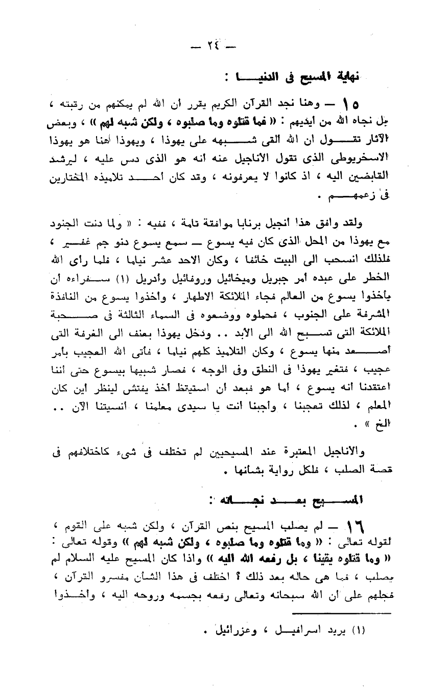 15- وهنا نجد القرآن الكريم يقرر أن الله لم يمكنهم من رقبته، بل نجاه الله من أيديهم: {وَمَا قَتَلُوهُ وَمَا صَلَبُوهُ وَلَكِنْ شُبِّهَ لَهُمْ} ، وبعض الآثار تقول أن الله ألقى شبهه على يهوذا، ويهوذا هنا هو يهوذا الاسخريوطي الذي تقول الأناجيل عنه إنه هو الذي دس عليه، ليرشد القابضين إليه، إذ كانوا لا يعرفونه، وقد كان أحد تلاميذه المختارين في زعمهم.