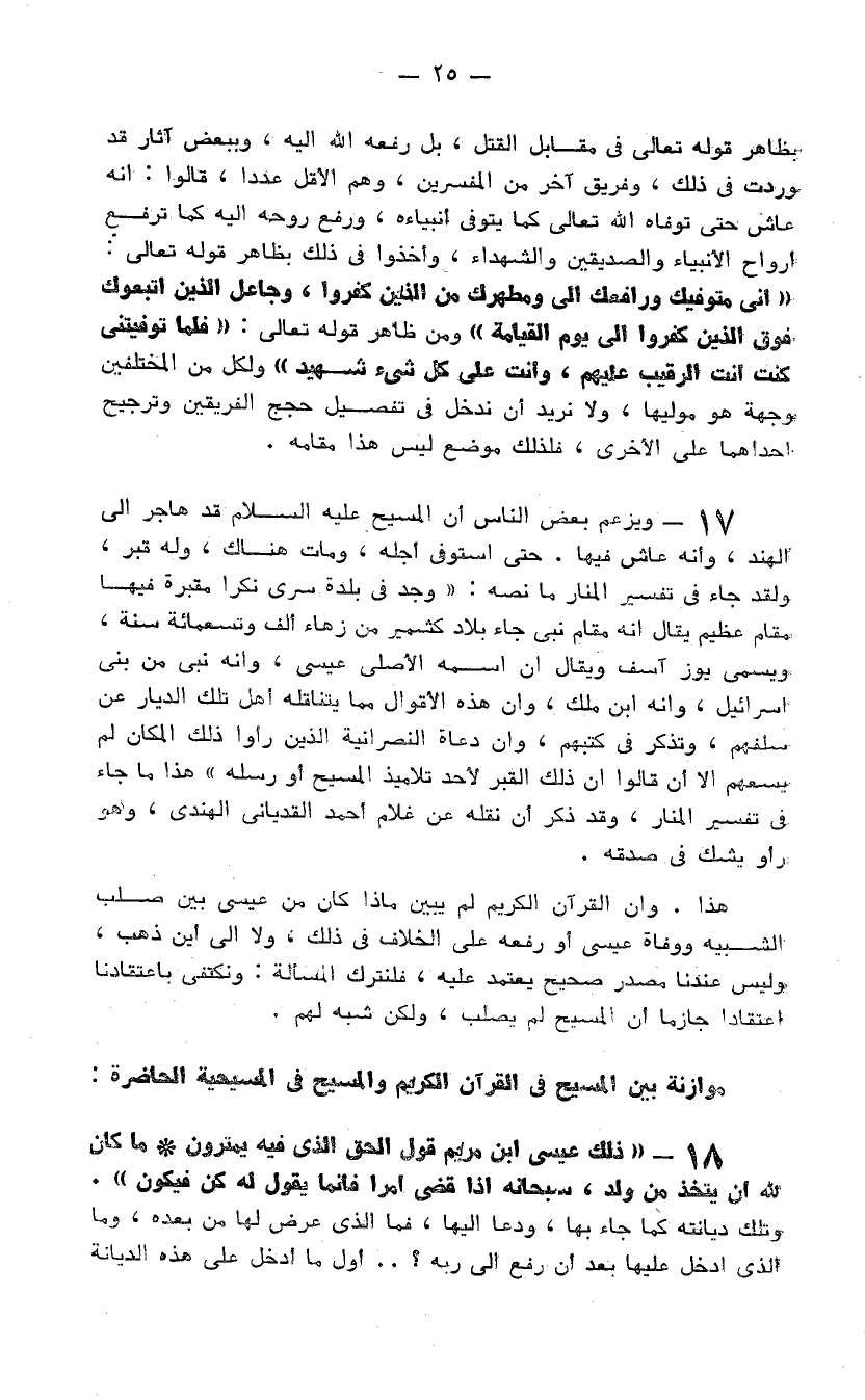 17- ويزعم بعض الناس أن المسيح عليه السلام قد هاجر إلى الهند، وإنه عاش فيها. حتى استوفى أجله، ومات هناك، وله قبر، ولقد جاء في تفسير المنار ما نصه: "وجد في بلدة سرى نكرا مقبرة فيها مقام عظيم يقال إنه مقام نبي جاء بلاد كثير من زهاء ألف وتسعمائة سنة، ويسمى يوز آسف ويقال أن اسمه الأصلي عيسى، وإنه نبي من بني إسرائيل، وإنه ابن ملك، وأن هذه الأقوال مما يتناقله أهل تلك الديار عن سلفهم، وتذكر في كتبهم، وإن دعاة النصرانية الذين رأوا ذلك المكان لم يسعهم إلا أن قالوا أن ذلك القبر لأحد تلاميذ المسيح أو رسله" هذا ما جاء في تفسير المنار، وقد ذكر أن نقله عن غلام أحمد القديانى الهندي، وهو راو يشك في صدقه.