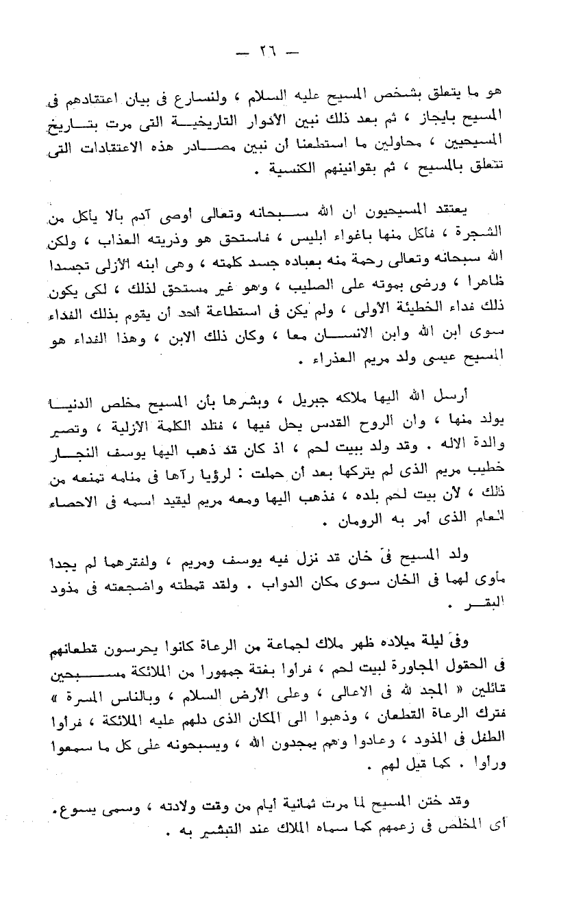 هو ما يتعلق بشخص المسيح عليه السلام، ولنسارع في بيان اعتقادهم في المسيح بإيجاز، ثم بعد ذلك نبين الأدوار التاريخية التي مرت بتاريخ المسيحيين. ومحاولين ما استطعنا أن نبين مصادر هذه الاعتقادات التي تتعلق بالمسيح، ثم بقوانينهم الكنسية.