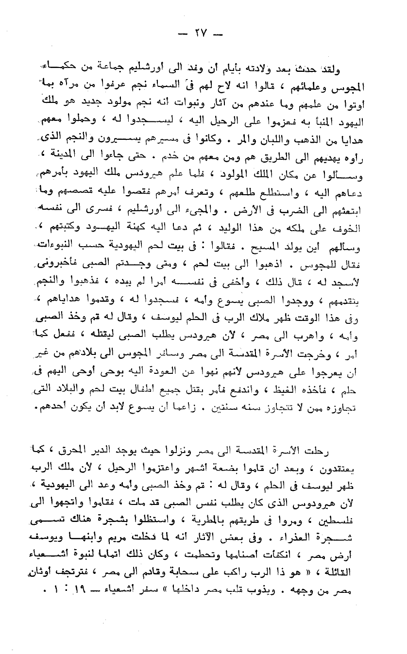 ولقد حدث بعد ولادته بأيام أن وفد إلى أورشليم جماعة من حكماء المجوس وعلمائهم، قالوا إنه لاح لهم في السماء نجم عرفوا من مرآه بما أوتوا من علمهم وما عندهم من آثار ونبوات إنه نجم مولود جديد هو ملك اليهود المنبأ به فعزموا على الرحيل إليه، ليسجدوا له، وحملوا معهم هدايا من الذهب واللبان والمر. وكانوا في مسيرهم يسيرون والنجم الذي رأوه يهديهم إلى الطريق هم ومن معهم من خدم، حتى جاءوا إلى المدينة، وسألوا عن مكان الملك المولود، فلما علم هيرودس ملك اليهود بأمرهم دعاهم إليه، واستطلع طلعهم، وتعرف أمرهم فقصوا عليه قصصهم وما ابتعثهم إلى الضرب في الأرض. والمجيء إلى أورشليم، فسرى إلى نفسه الخوف على ملكه من هذا الوليد، ثم دعا إليه كهنة اليهود وكتبتهم، وسألهم أين يولد المسيح، فقالوا: في بيت لحم اليهودية حسب النبوءات قتال المجوس. اذهبوا إلى بيت لحم، ومتى وجدتم الصبي فأخبروني لأسجد له، قال ذلك، وأخفى في نفسه أمراً لم يبده، فذهبوا والنجم يتقدمهم، ووجدوا الصبي يسوع وأمه، فسجدوا له، وقدموا هداياهم، وفي هذا الوقت ظهر ملاك الرب في الحلم ليوسف، وقال له قم وخذ الصبي وأمه، وأهرب إلى مصر، لأن هيرودس يطلب الصبي ليقتله، ففعل كما أمر، وخرجت الأسرة المقدسة إلى مصر وسافر المجوس إلى بلادهم من غير أن يعرجوا على هيرودس لأنهم نهوا عن العودة إليه بوحي أوحى إليهم في حلم، فأخذه الغيظ، واندفع فأمر بقتل جميع أطفال بيت لحم والبلاد التي تجاوره ممن لا يتجاوز سنة سنتين. زاعماً أن يسوع لابد أن يكون أحدهم.