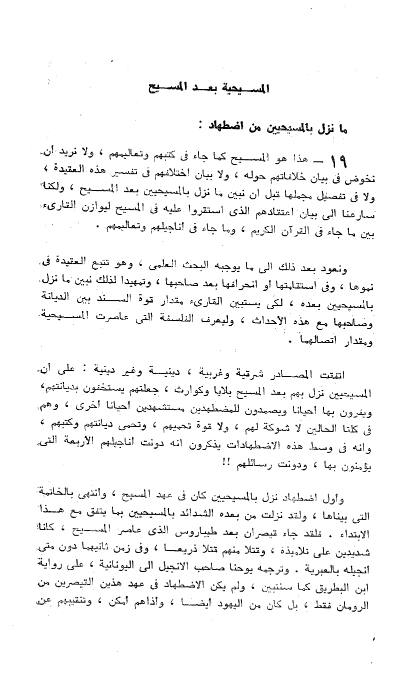 ونعود بعد ذلك إلى ما يوجبه البحث العلمي، وهو تتبع العقيدة في نموها، وفي استقامتها أو انحرافها بعد صاحبها، وتمهيداًً لذلك نبين ما نزل بالمسيحيين بعده، لكي يستبين القارئ مقدار السند بين الديانة. وصاحبها مع هذه الأحداث، وليعرف الفلسفة التي عاصرت المسيحية ومقدار اتصالهما