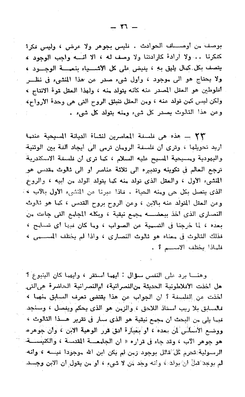 23- هذه هي فلسفة المعاصرين لنشأة الديانة المسيحية عندما أريد تحويلها، وترى أن فلسفة الرومان ترمي إلى إيجاد ألفة بين الوثنية واليهودية ومسيحية المسيح عليه السلام، كما ترى أن فلسفة الإسكندرية ترجع العالم في تكوينه وتدبيره إلى ثلاثة عناصر أو إلى ثالوث مقدس هو المنشئ الأول، والعقل الذي تولد منه كما يتولد الولد من أبيه، والروح الذي يتصل بكل حي ومنه الحياة. فإذا عبرنا عن المنشئ الأول بالأب، وعن العقل المتولد عنه بالابن، وعن الروح بروح القدس، كما هو ثالوث النصارى الذي أخذ ببعضه مجمع نيقية، وبكله المجامع التي جاءت من بعده، لما خرجنا في التسمية عن الصواب، وما كان فيها أي تسامح، فذلك الثالوث في معناه هو ثالوث النصارى، وإذا لم يختلف المسمى، فلماذا يختلف الاسم؟.