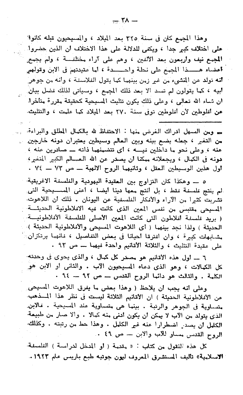 5- وهكذا كان التزاوج بين العقيدة اليهودية والفلسفة الإغريقية لم ينتج فلسفة فقط، بل أنتج معها ديناً أيضاًَ، أعني المسيحية التي تشربت كثيراً من الآراء والأفكار الفلسفية عن اليونان. ذلك أن اللاهوت المسيحي مقتبس من نفس المعين الذي كانت فيه الأفلاطونية الحديثة (بريد فلسفة أفلاطون التي كانت المعين الأصلي للفلسفة الأفلاطونية الحديثة) ولذا نجد بينهما (أي اللاهوت المسحي والأفلاطونية الحديثة) . مشابهات كبيرة، وإن افترقا أحياناً في بعض التفاصيل، فإنهما يرتكزان على عقيدة التثليث، والثلاثة الأقانيم واحدة فيهما - ص 93.