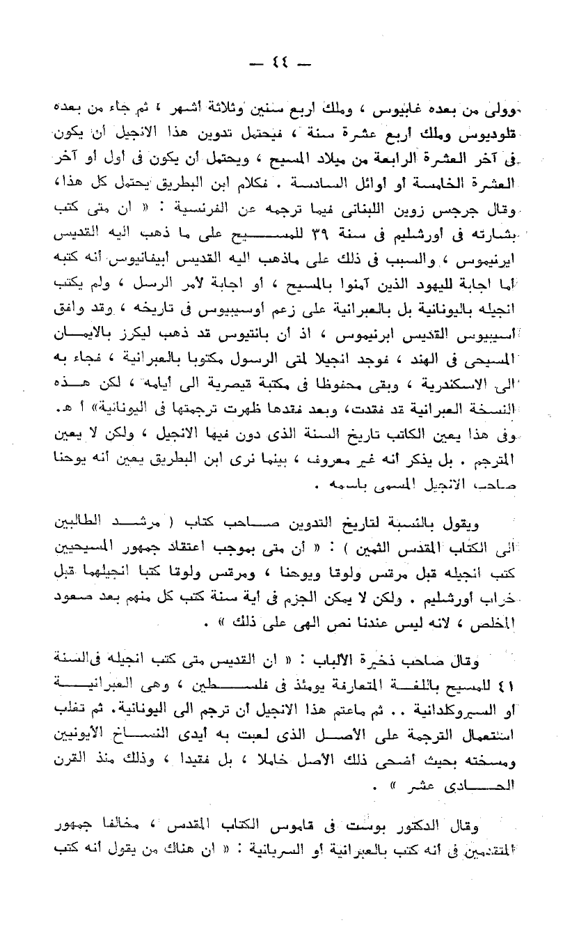 وقال صاحب ذخيرة الألباب: "أن القديس متى كتب إنجيله في السنة 41 للمسيح باللغة المتعارفة يومئذ في فلسطين، وهي العبرانية أو السبروكلدانية ... ثم ما عتم هذا الإنجيل أن ترجم إلى اليونانية. ثم تغلب استعمال الترجمة على الأصل الذي لعبت به أيدي النساخ الأيونيين ومسخته بحيث أضحى ذلك الأصل خاملاً، بل فقيداً، وذلك منذ القرن الحادي عشر".