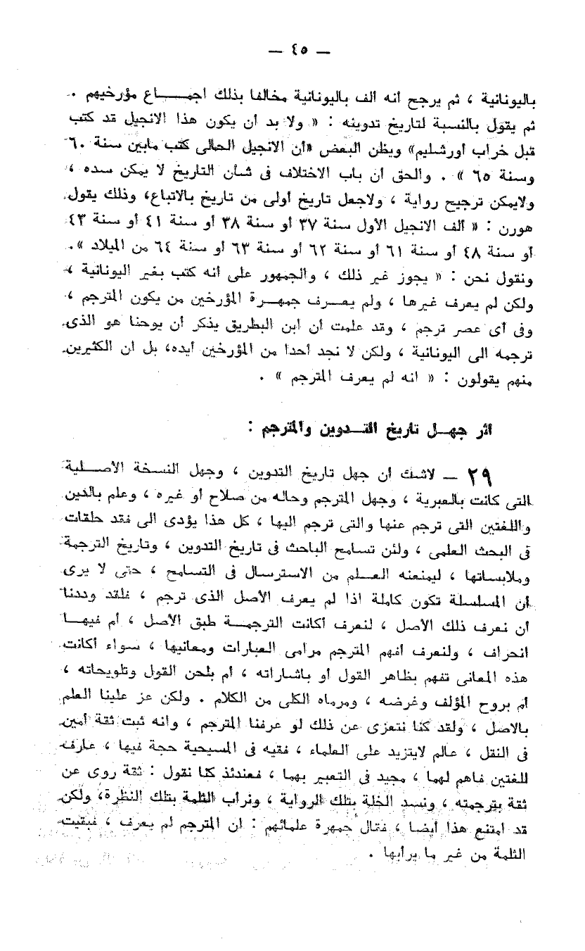 29- لا شك أن جهل تاريخ التدوين، وجهل النسخة الأصلية التي كانت بالعبرية، وجهل المترجم وحاله من صلاح أو غيره، وعلم بالدين واللغتين التي ترجم عنها والتي ترجم إليها، كل هذا يؤدي إلى فقد حلقات في البحث العلمي، ولئن تسامح الباحث في تاريخ التدوين، وتاريخ الترجمة وملابساتها، ليمنعنه المسلم من الاسترسال في التسامح، حتى لا يرى أن السلسلة تكون كاملة إذا لم يعرف الأصل الذي ترجم، فلقد وددنا أن نعرف ذلك الأصل، لنعرف أكانت الترجمة طبق الأصل، أم فيها انحراف، ولنعرف أفهم المترجم مرامي العبارات ومعانيها، سواء أكانت هذه المعاني تفهم بظاهر القول أو بإشاراته، أم بلحن القول وتلويحاته، أم بروح المؤلف وغرضه، ومرماه الكلي من الكلام، ولكن عز علينا العلم بالأصل، ولقد كنا نتعزى عن ذلك لو عرفنا المترجم، وإنه ثبت ثقة أمين في النقل، عالم لا يتزيد على العلماء، ففيه في المسيحية حجة فيها، عارف للغتين فاهم لهما، مجيد في التعبير بهما، فعندئذ كنا نقول: ثقة روي عن ثقة بترجمته، ونسدد الخلة بتلك الرواية، ونرأب الثلمة بتلك النظرة، ولكن قد امتنع هذا أيضاً، فقال جمهرة علمائهم: أن المترجم لم يعرف، فبقيت الثلمة من غير ما يرأبها.