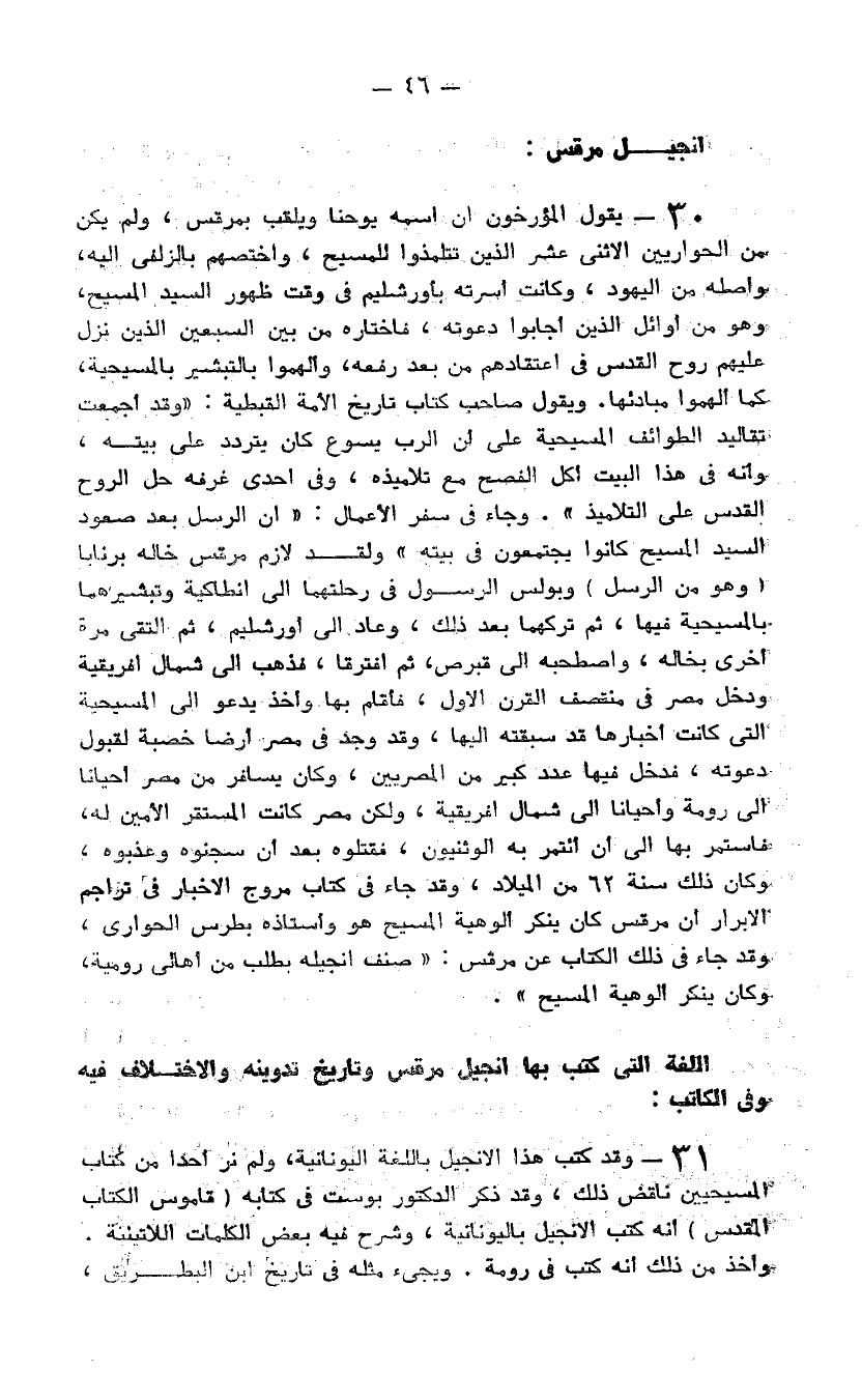 30- يقول المؤرخين أن اسمه يوحنا ويلقب بمرقس، ولم يكن من الحواريين الاثني عشر الذين تتلمذوا للمسيح، واختصهم بالزلفى إليه، وأصله من اليهود، وكانت أسرته بأورشليم في وقت ظهور السيد المسيح، وهو من أوائل الذين أجابوا دعوته، فاختاره من بين السبعين الذين نزل عليهم روح القدس في اعتقادهم من بعد رفعه، وألهموا بالتبشير بالمسيحية، كما ألهموا مبادئها. ويقول صاحب كتاب تاريخ الأمة القبطية: "وقد أجمعت تقاليد الطوائف المسيحية على أن الرب يسوع كان يتردد على بيته، وإنه في هذا البيت أكل النصح مع تلاميذه، وفي إحدى غرفه حل الروح القدس على التلاميذ". وجاء في سفر الأعمال: "أن الرسل بعد صعود السيد المسيح كانوا يجتمعون في بيته" ولقد لازم مرقس خاله برنابا (وهو من الرسل) وبولس الرسول في رحلتها إلى أنطاكية وتبشيرهما بالمسيحية فيها، ثم تركها بعد ذلك، وعاد إلى أورشليم، ثم التقى مرة أخرى بخاله، واصطحبه إلى قبرص، ثم افترقا، فذهب إلى شمال أفريقية ودخل مصر في منتصف القرن الأول، فأقام بها وأخذ يدعو إلى المسيحية التي كانت أخبارها قد سبقته إليها، وقد وجد في مصر أرضاً خصبة لقبول دعوته، فدخل فيها عدد كبير من المصريين، وكان يسافر من مصر أحياناً إلى رومة وأحياناً إلى شمال أفريقية، ولكن مصر كانت المستقر الأمين له، فأستمر بها إلى أن ائتمر به الوثنيون، فقتلوه بعد أن سجنوه وعذبوه، وكان ذلك سنة 62 من الميلاد، وقد جاء في كتاب مروج الأخبار في تراجم الأبرار أن مرقس كان ينكر ألوهية المسيح هو وأستاذه بطرس الحواري، وقد جاء في ذلك الكتاب عن مرقس: "صنف إنجيله بطلب من أهالي رومية، وكان ينكر ألوهية المسيح".