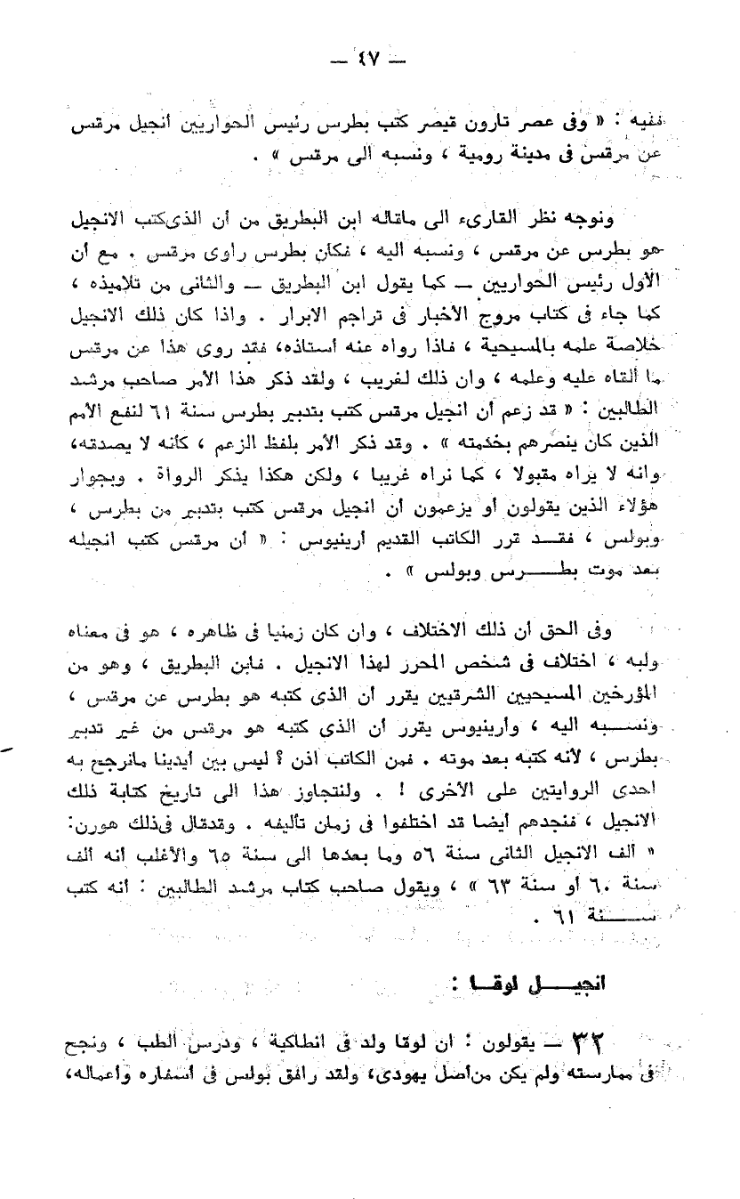 ونوجه نظر القارئ إلى ما قاله ابن البطريق من أن الذي كتب الإنجيل هو بطرس عن مرقس، ونسبه إليه، فكان بطرس راوي مرقس، مع أن الأول رئيس الحواريين - كما يقول ابن البطريق - والثاني من تلاميذه، كما جاء في كتاب مروج الأخبار في تراجم الأبرار. وإذا كان ذلك الإنجيل خلاصة علمه بالمسيحية، فإذا رواه عنه أستاذه، فقد روى هذا عن مرقس ما ألقاه عليه وعلمه، وإن ذلك لغريب، ولقج ذكر هذا الأمر صاحب مرشد الطالبين: "قد زعم إنجيل مرقس كتب بتدبير بطرس سنة 61 لنفع الأمم الذين كان ينصرهم بخدمته". وقد ذكر الأمر بلفظ الزعم، كأنه لا يصدقه، وإنه لا يراه مقبولاً، كما نراه غريباً، ولكن هكذا يذكر الرواة. وبجوار هؤلاء الذين يقولون أو يزعمون أن إنجيل مرقس كتب بتدبير من بطرس، وبولس، فقد قرر الكاتب أرينيوس: "أن مرقس كتب إنجيله بعد موت بطرس وبولس".