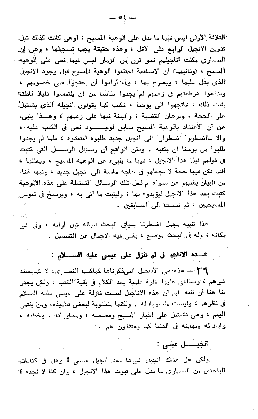 36- هذه هي الأناجيل التي ذكرناها كما كتب النصارى، لا كما يعتقد غيرهم، وسنلقي عليها نظرة علمية بعد الكلام في بقية الكتب، ولكن يجدر بنا هنا أن ننبه إلى أن هذه الأناجيل ليست نازلة على عيسى عليه السلام في نظرهم، وليست منسوبة له. ولكنها منسوبة لبعض تلاميذه، ومن ينتمي إليهم، وهي تشتمل على أخبار المسيح وقصصه، ومحاوراته، وخطبه وابتدائه ونهايته في الدنيا كما يعتقدون هم.