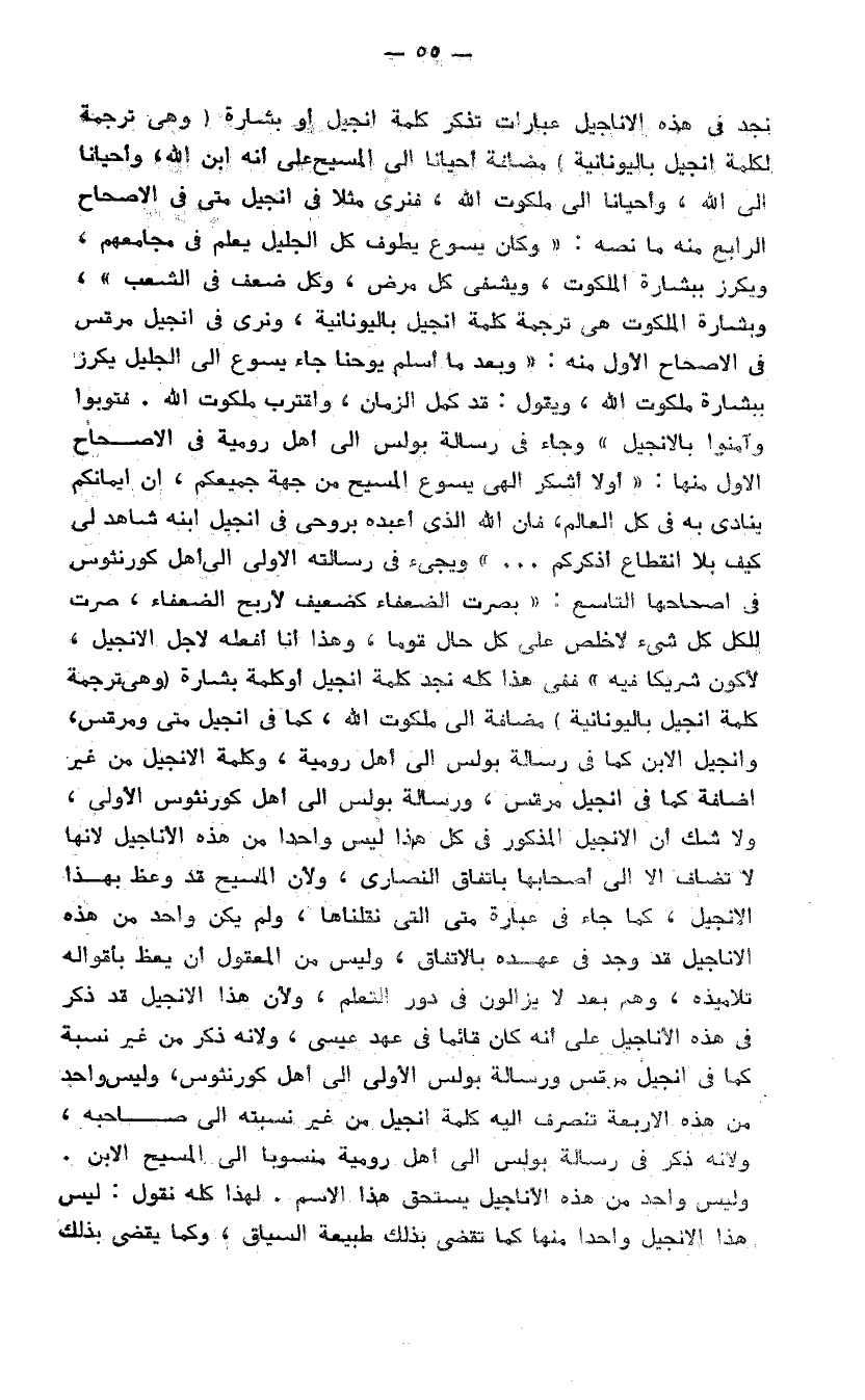 وجاء في رسالة بولس إلى أهل رومية في الإصحاح الأول منها: "أولاً أشكر إلهي يسوع المسيح من جهة جميعكم، إن إيمانكم ينادي به في كل العالم، فإن الله الذي أعبده بروجي في إنجيل ابنه شاهد لي كيف بلا انقطاع أذكركم ... " ويجيء في رسالته الأولى إلى أهل كورنئوس في إصحاحها التاسع: "بصرت الضعفاء كضعيف لأربح الضعفاء، صرت للكل كل شيء لأخلص على كل حال قوماً، وهذا أنا أفعله لأجل الإنجيل، لأكون شريكاً فيه" ففي هذا كله نجد كلمة إنجيل أو كلمة بشارة (وهي ترجمة كلمة إنجيل باليونانية) مضافة إلى ملكوت الله، كما في إنجيل متى ومرقس، وإنجيل الابن كما في رسالة بولس إلى أهل رومية، وكلمة الإنجيل من غير إضافة كما في إنجيل مرقس، ورسالة بولس إلى أهل كورنئوس الأولى، ولا شك أن الإنجيل المذكور في كل هذا ليس واحداً من هذه الأناجيل لأنها لا تضاف إلا إلى أصحابها باتفاق النصارى، ولأن المسيح قد وعظ بهذا الإنجيل، كما جاء في عبارة متى التي نقلناها، ولم يكن واحداً من هذه الأناجيل قد وجد في عهده بالاتفاق، وليس من المعقول أن يعظ بأقواله تلاميذه، وهم بعد لا يزالون في دور التعلم، ولأن هذا الإنجيل قد ذكر في هذه الأناجيل على إنه كان قائماً في عهد عيسى، ولأنه ذكر من غير نسبة كما في إنجيل مرقس ورسالة بولس الأولى إلى أهل كورنئوس، وليس واحد من هذه الأربعة تنصرف إليه كلمة إنجيل من غير نسبته إلى صاحبه، ولأنه ذكر في رسالة بولس إلى أهل رومية منسوباً إلى المسيح الابن، وليس واحد من هذه الأناجيل يستحق هذا الاسم. لهذا كله نقول: ليس هذا الإنجيل واحداً منها كما تقضى بذلك طبيعة السياق، وكما يقضى بذلك