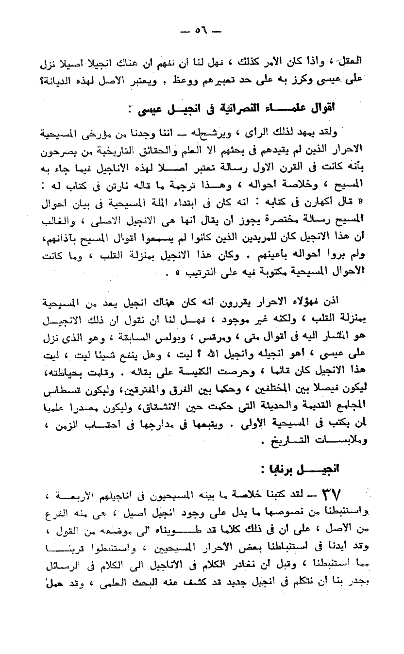 37- لقد كتبنا خلاصة ما بينه المسيحيون في أناجيلهم الأربعة، واستنبطنا من نصوصها ما يدل على وجود إنجيل أصيل، هي منه الفرع من الأصل، على أن في ذلك كلاماً قد طويناه إلى موضعه من القول، وقد أيدنا في استنباطنا بعض الأحرار المسيحيين، واستنبطوا قريناً مما استنبطنا، وقبل أن نغادر الكلام في الأناجيل إلى الكلام في الرسائل يجدر بنا أن نتكلم في إنجيل جديد قد كشف عنه البحث العلمي، وقد حمل