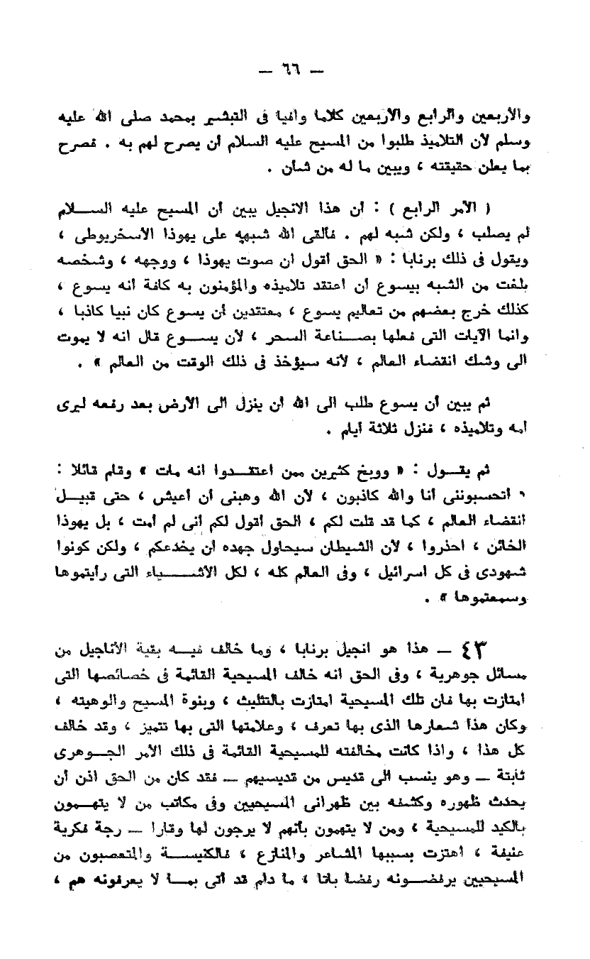 والأربعين والرابع والأربعين كلاماً وافياً في التبشير بمحمد - صلى الله عليه وسلم - لأن التلاميذ طلبوا من المسيح عليه السلام أن يصرح لهم به. فصرح بما يطن حقيقته، ويبين ما له من شأن.
