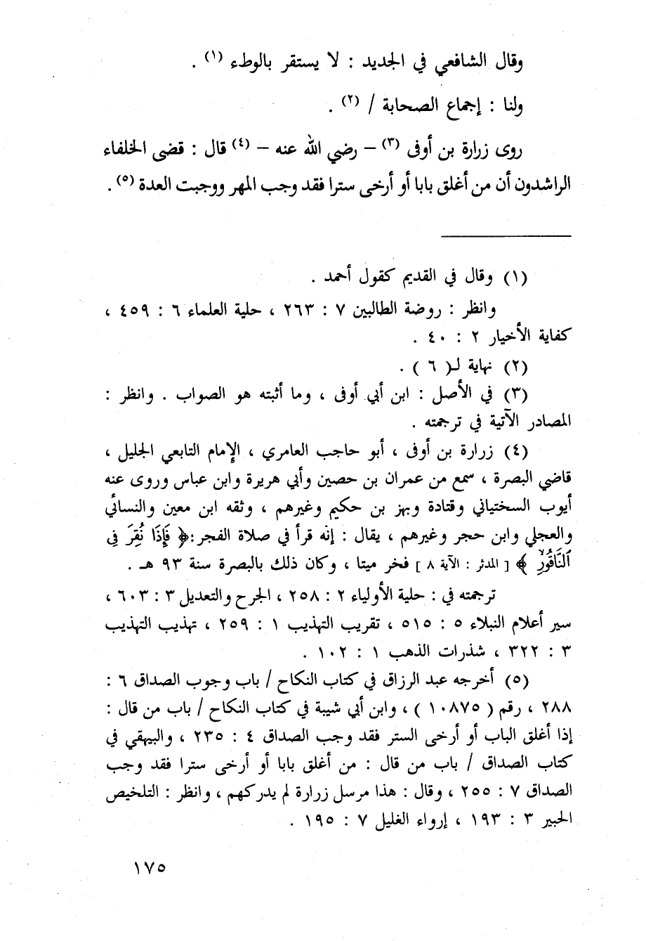(5) أخرجه عبد الرزاق في كتاب النكاح/ باب وجوب الصداق6: 288، رقم (10875) ، وابن أبي شيبة في كتاب النكاح/ باب من قال: إذا أغلق الباب أو أرخى الستر فقد وجب الصداق4: 235، والبيهقي في كتاب الصداق/ باب من قال:؛ من أغلق بابا أو أرخى سترا فقد وجب الصداق7/ 255، وقال: هذا مرسل زرارة لم يدركهم، وانظر: التلخيص الحبير3: 193، إرواء الغليل7: 195.