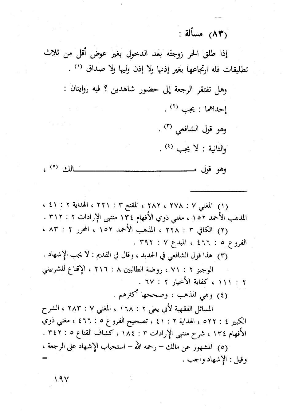 (5) المشهور عن مالك – رحمه الله- استحباب الإشهاد على الرجعة، وقيل: الإشهاد واجب. التفريع2: 76، القوانين الفقهية155، بداية المجتهد2: 85، أسهل المدارك2: 138، سراج السالك2: 79.